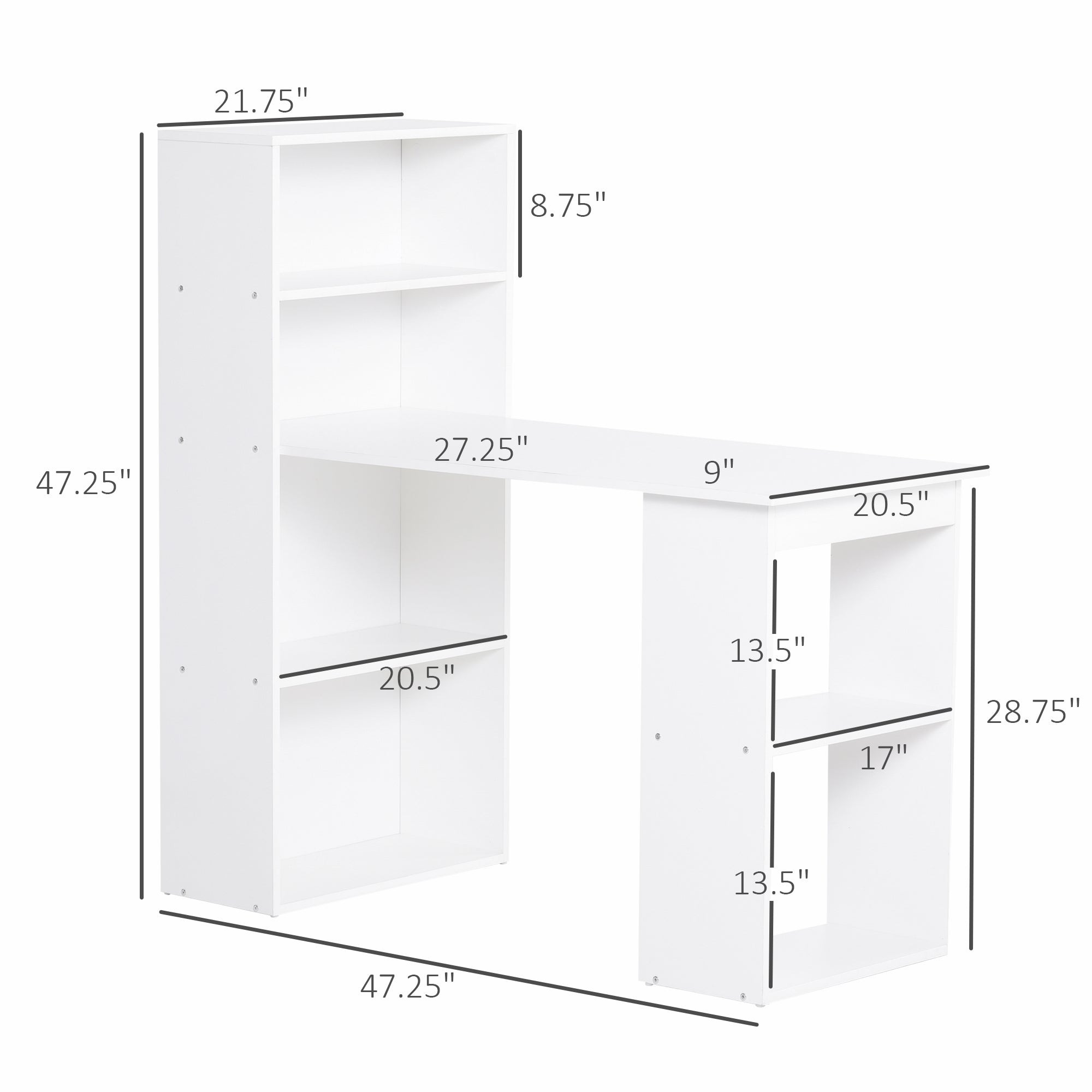 - Desk with Shelves Information: Overall Dimensions: 47.25" L x 20.5" W x 47.25" H. Weight Capacity: 44 lbs. (desktop) and 11 lbs. (each shelf).