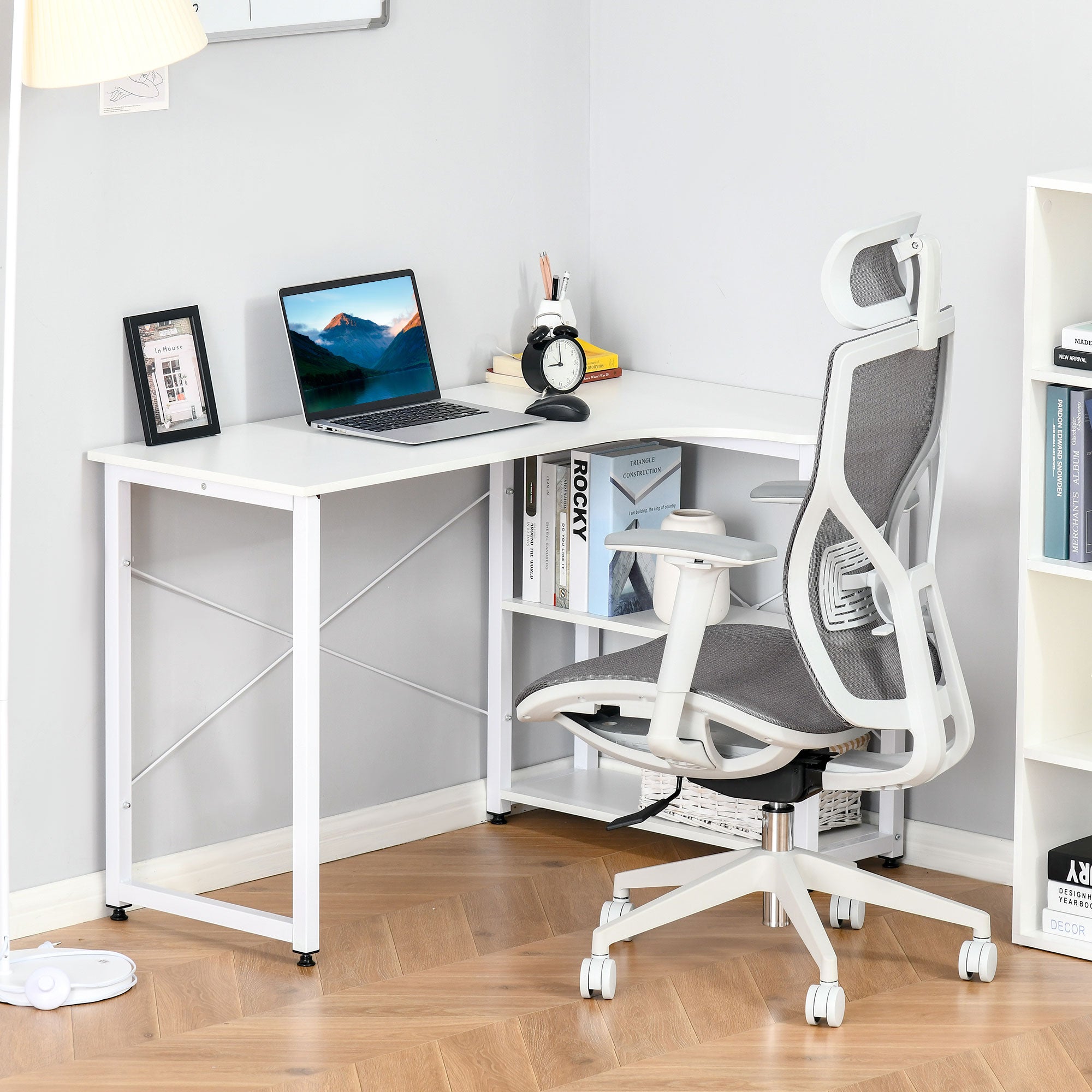 Create a bright, organized workspace with this modern industrial L-shaped corner desk — designed to maximize your floor area while delivering durable support and practical storage. Its clean white finish and steel frame blend into contemporary home offices, dorm rooms, and studios, giving you a roomy workstation and handy shelving for everyday essentials.