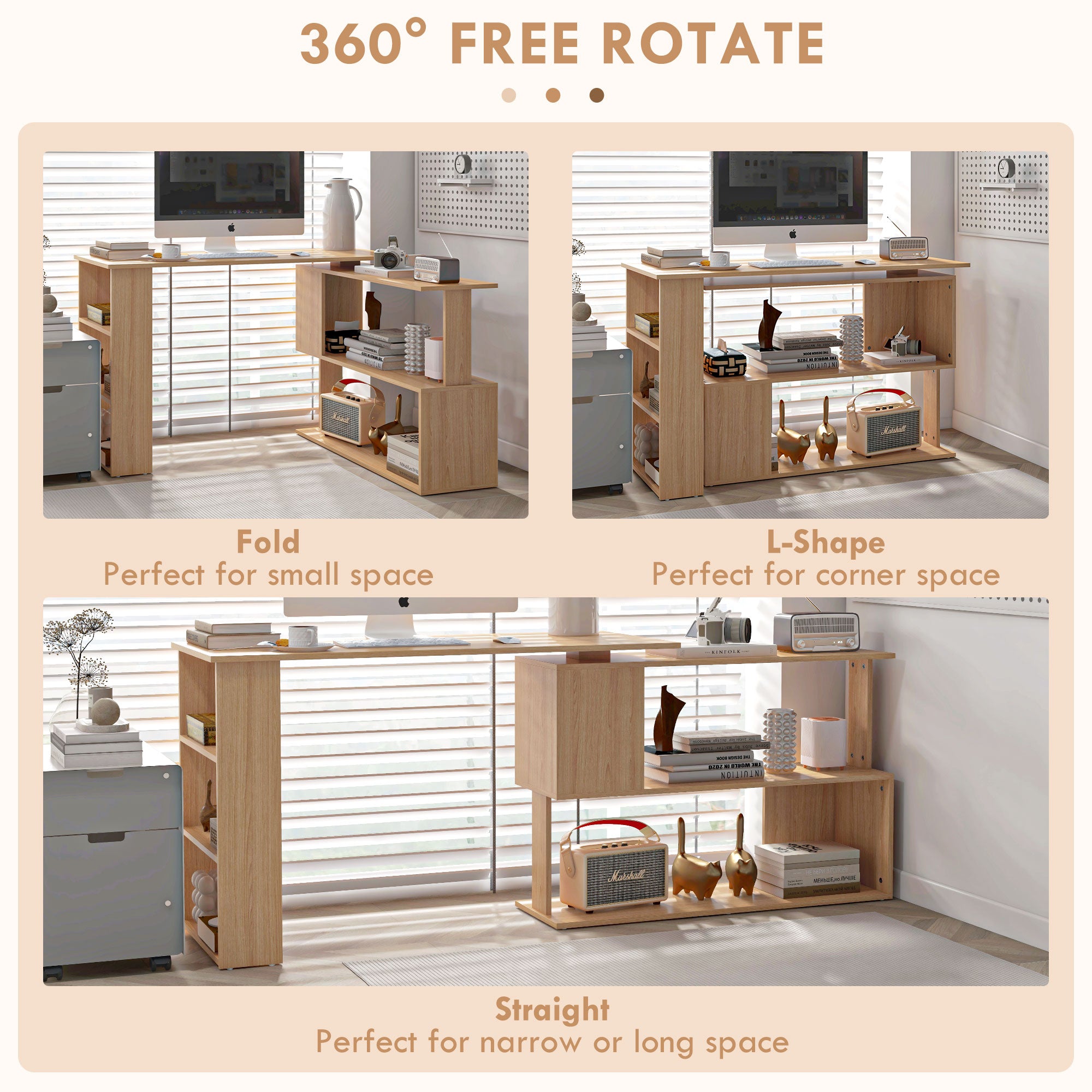 - 360° Rotating Design: Both the desk surface and the integrated shelf rotate to form either an L-shaped corner setup or a straight configuration to suit different spaces and workflows.