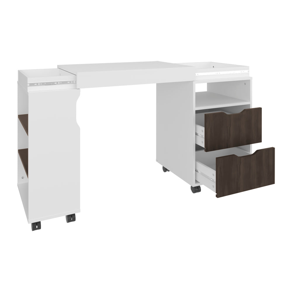 Transform your space with a versatile desk that converts from a compact storage unit into a roomy workstation—ideal for small apartments, home offices, or multi-use rooms. Clean lines and a two-tone White/Dark Walnut finish blend modern style with warm wood tones, while durable construction and smooth casters make it a practical, long-lasting addition to your home.