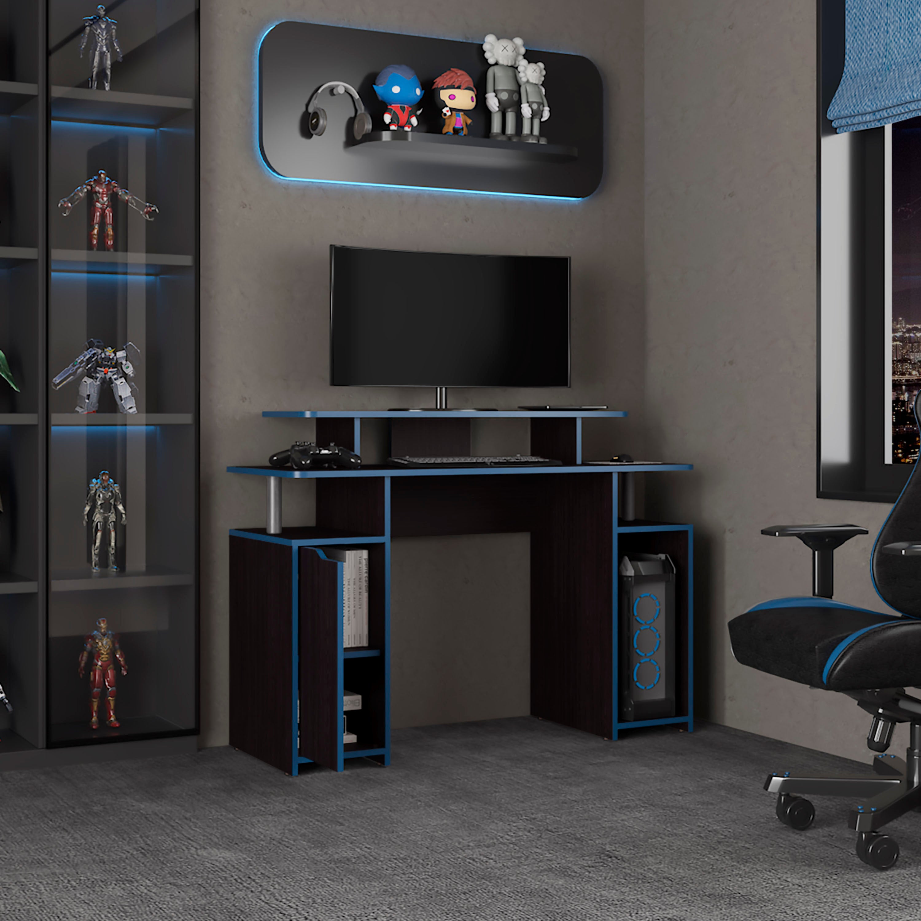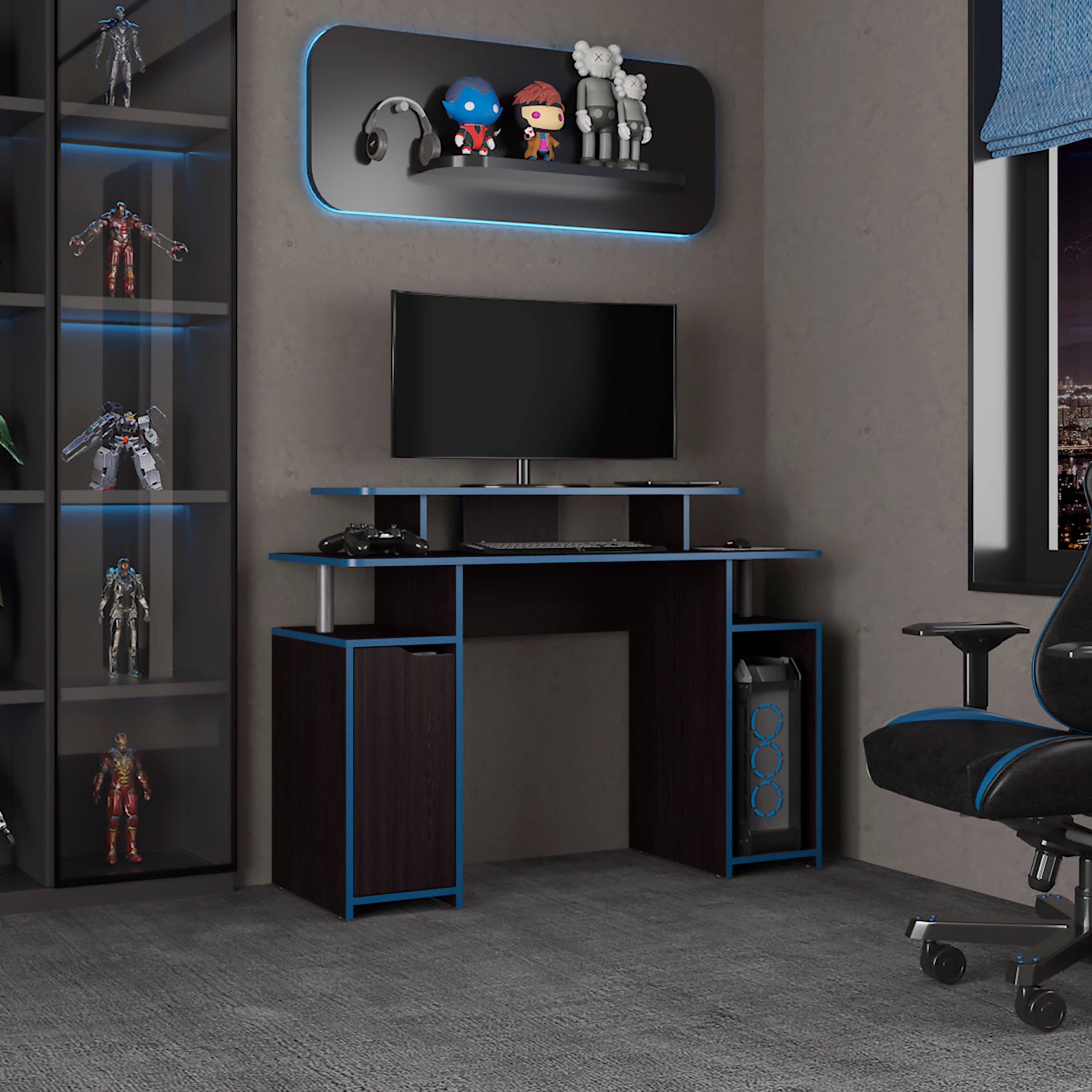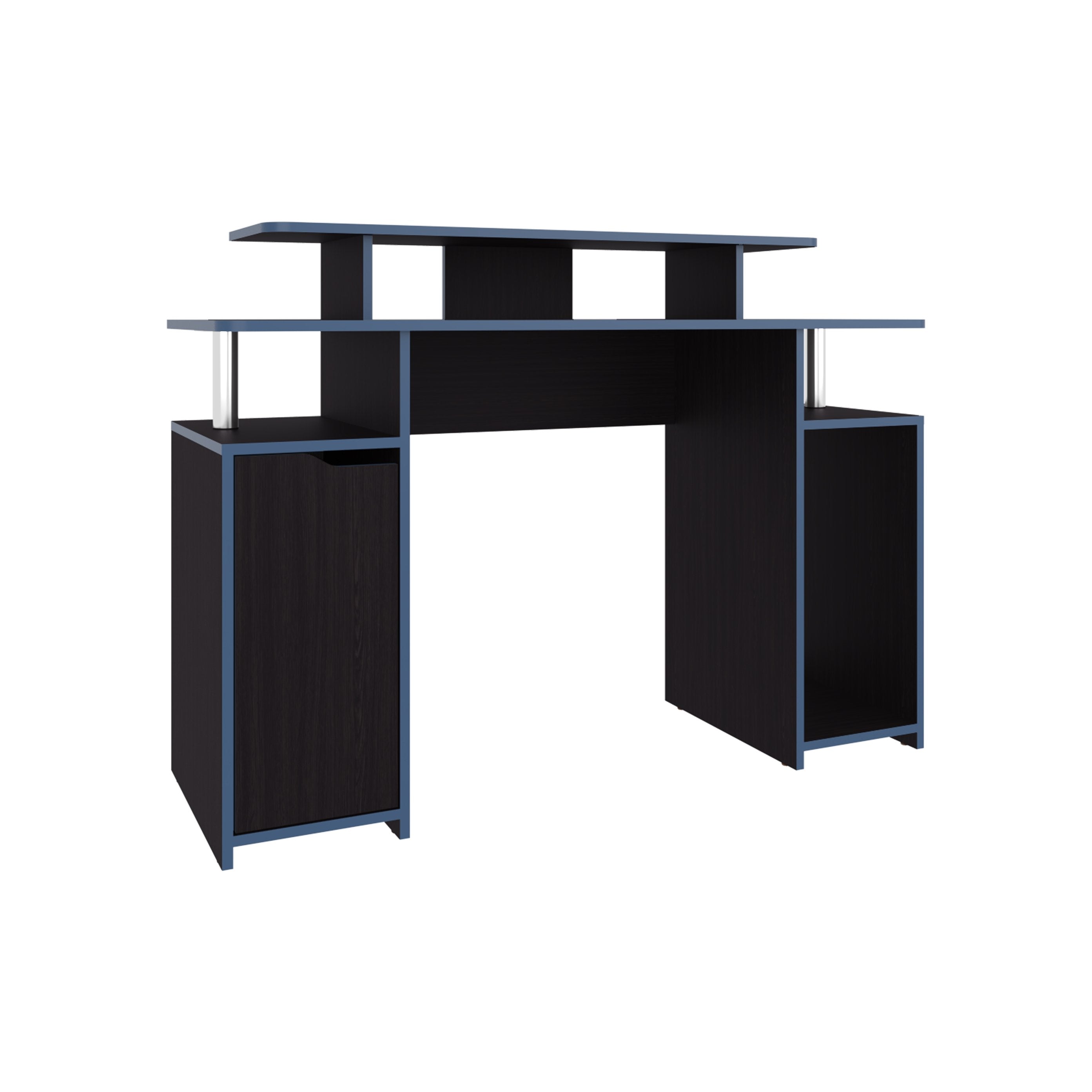 Upgrade your gaming setup with a streamlined, modern desk engineered for both performance and organization. This two-tier desktop delivers generous surface area for multiple monitors and peripherals while integrated shelving and a dedicated PC tower stand keep your gear accessible and your space clutter-free — all wrapped in a durable black finish with bold blue edge accents for a dynamic look.