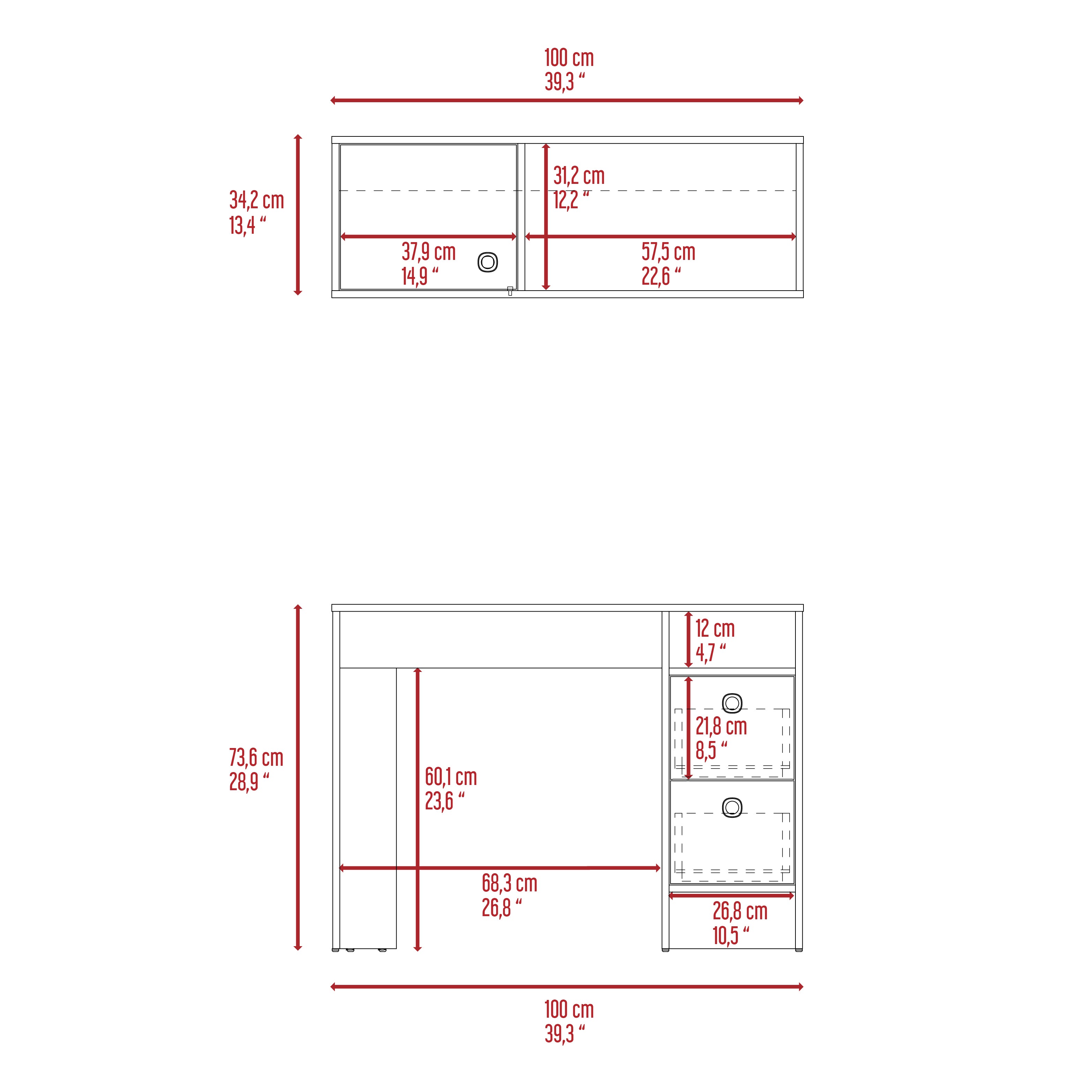 - Storage & Organization: Two desk drawers keep supplies out of sight; the open shelf offers quick-access storage; the wall cabinet’s single door conceals additional shelving for documents or décor.