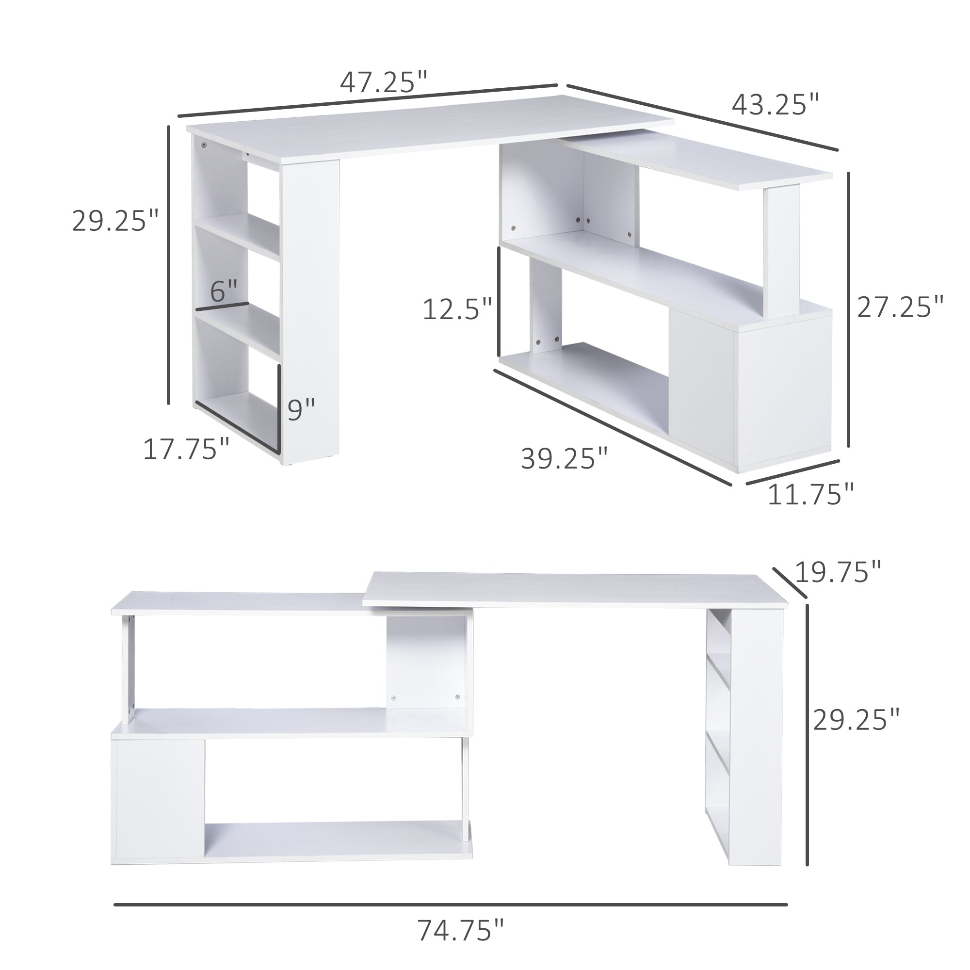 Bring modern efficiency to your workspace with this adaptable L-shaped corner desk. Designed for small spaces without sacrificing storage or function, the desk features a rotating configuration and multiple shelving options to keep your home office organized and productive. Its clean white finish and durable laminated particleboard construction blend style with easy maintenance.