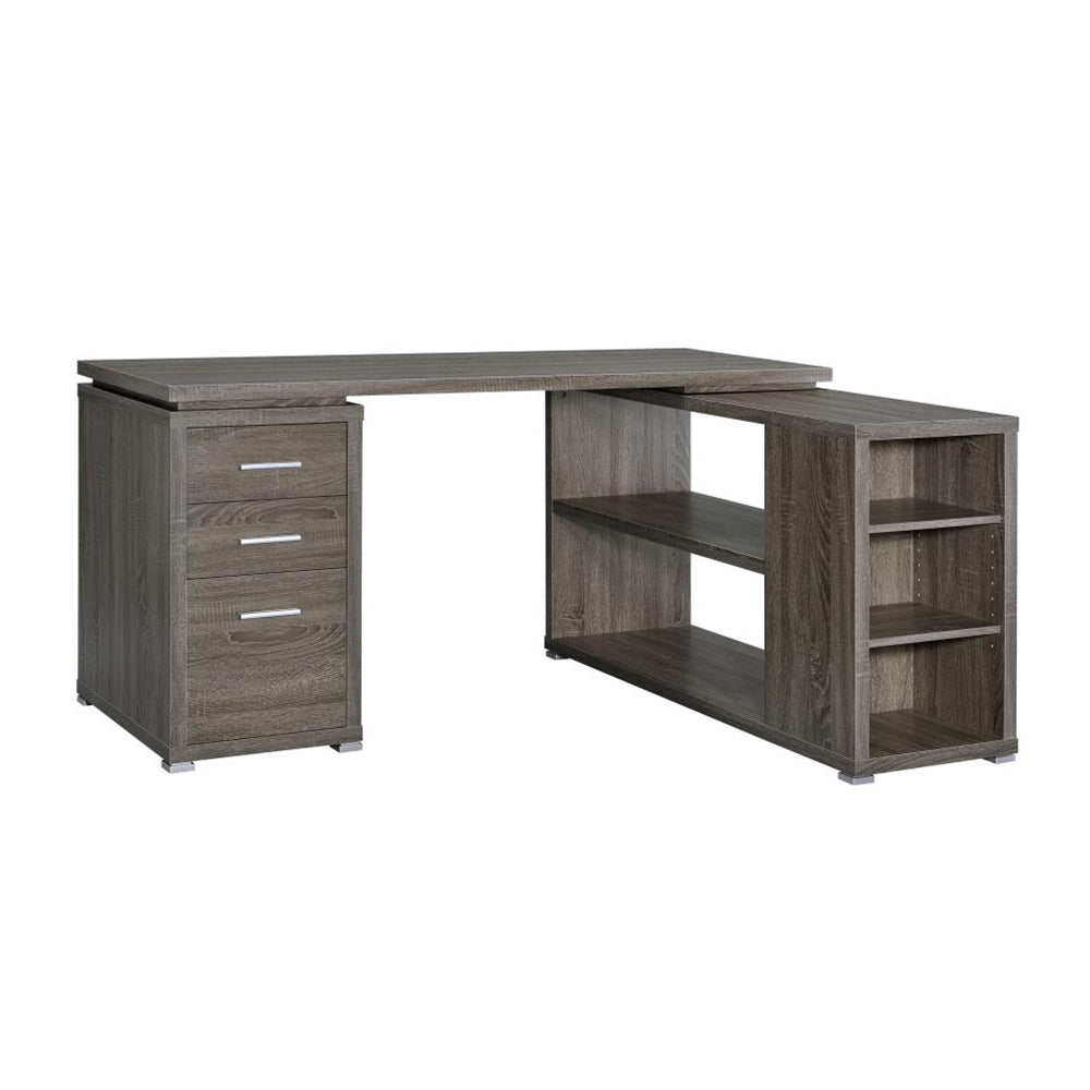 - L-shape office desk with articulating return in weathered grey finish