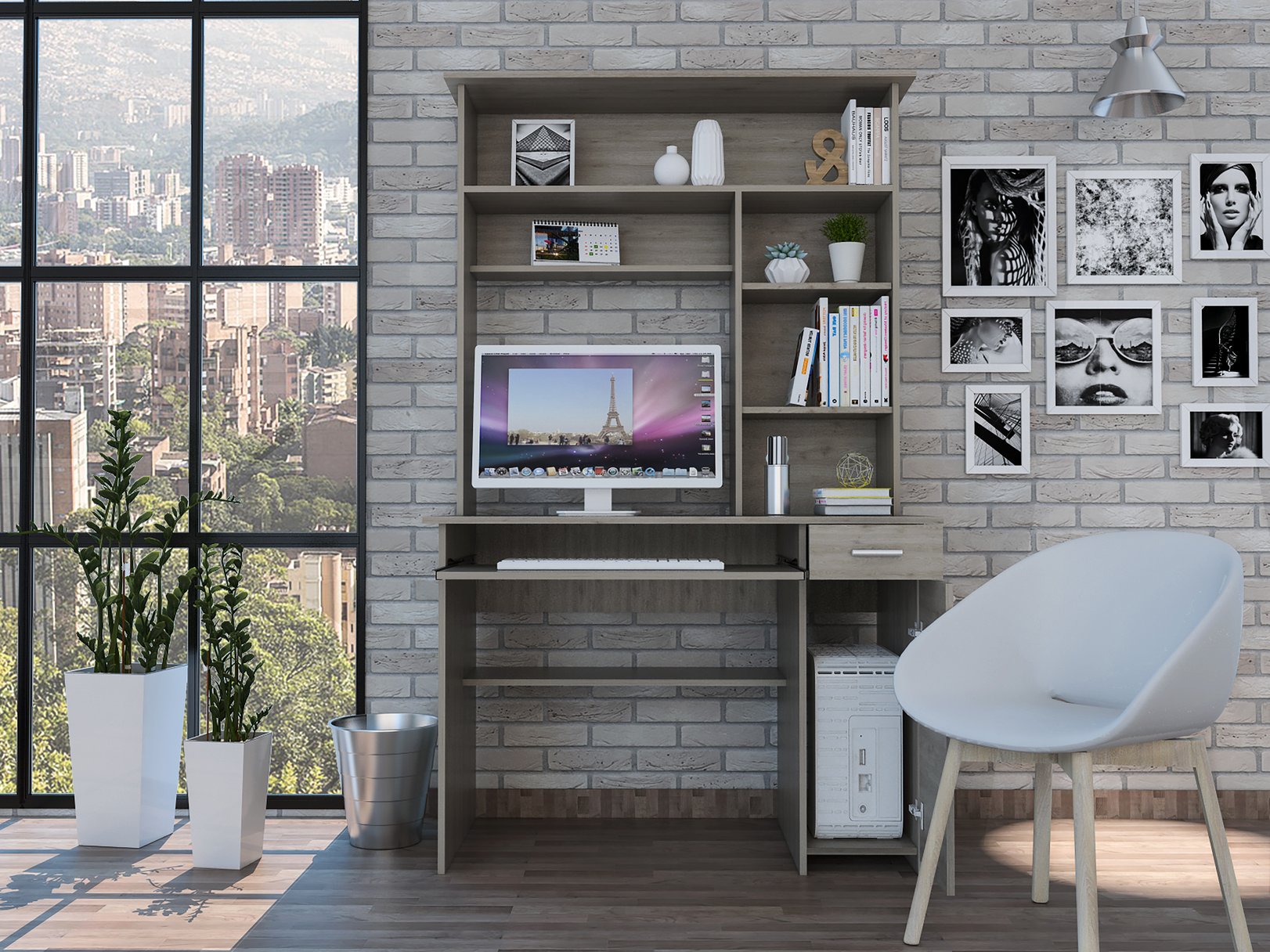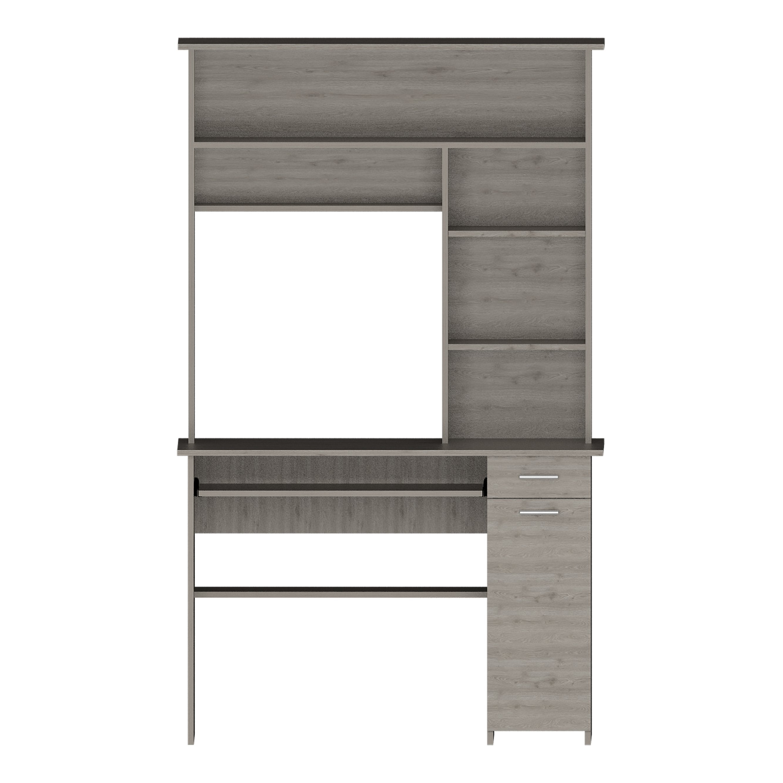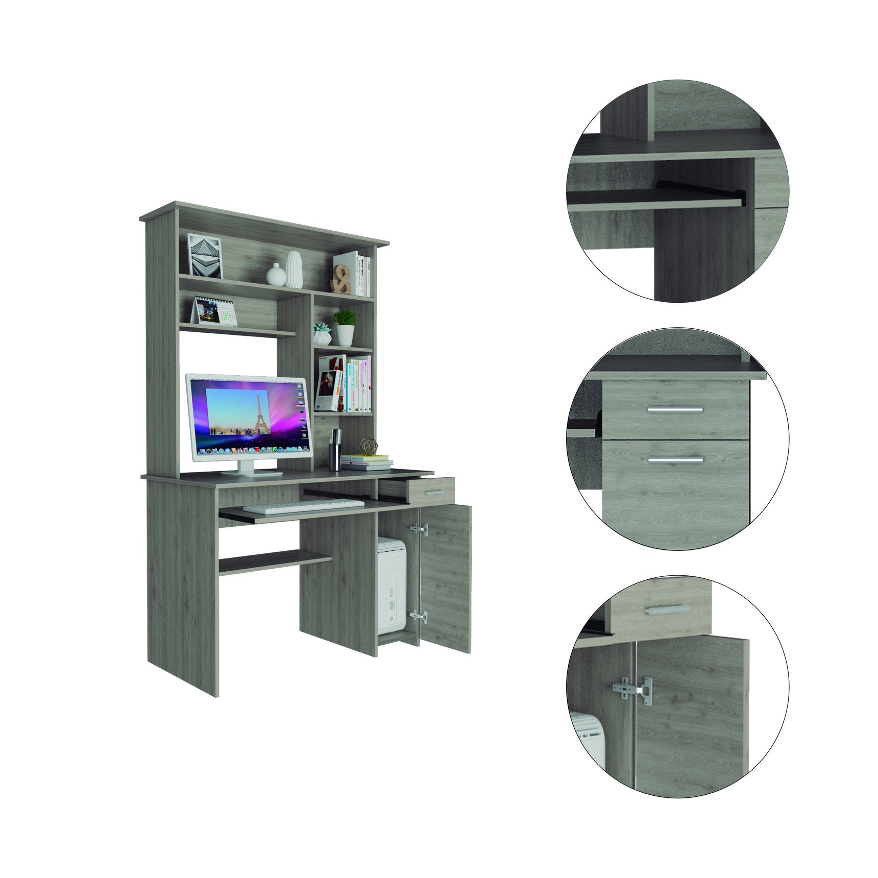 This stylish light gray computer desk with hutch combines roomy work surface, smart storage, and a clean modern silhouette to keep your home office organized and looking polished. Designed for functionality and display, it offers dedicated space for a computer and peripherals plus multiple shelves and drawers to store documents, books, and decor.