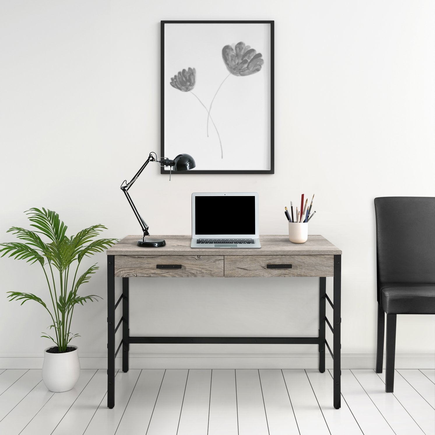 - Finish: Light weathered oak top contrasts with a matte black frame for a modern, versatile aesthetic that complements many décor styles