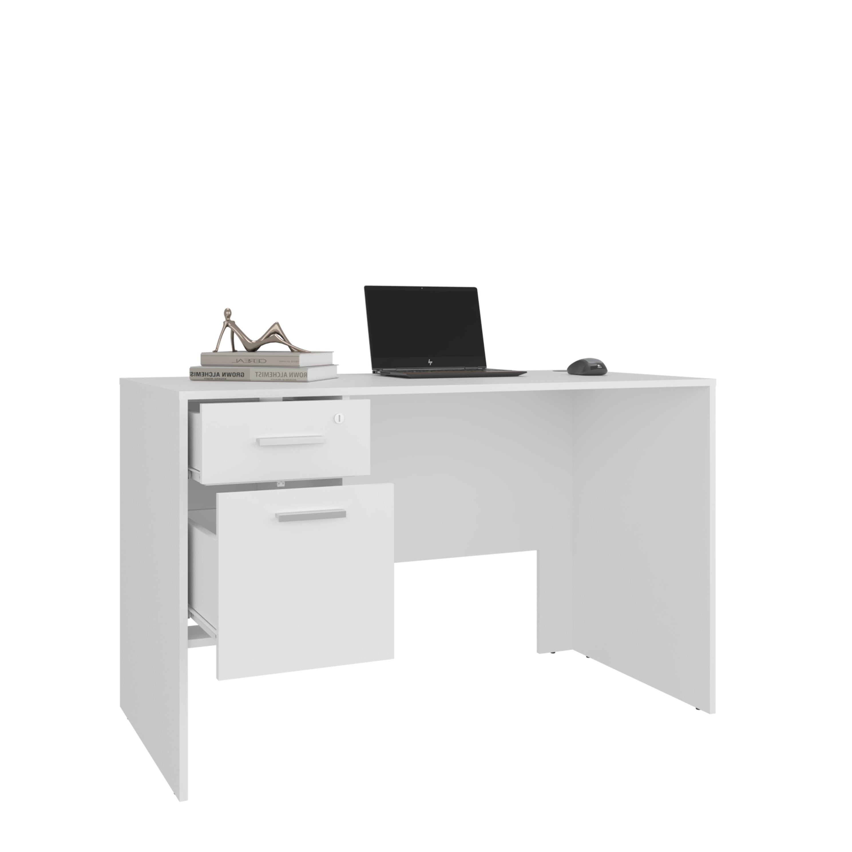 Create a clean, organized work area without sacrificing style. This compact modern desk combines a roomy work surface with smart storage — two drawers plus side shelving — making it ideal for bedrooms, apartments, or small home offices. Its sleek white finish and engineered wood construction deliver a durable, contemporary look that blends with most interiors while maximizing productivity in limited space.