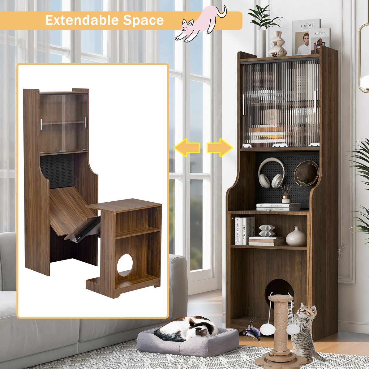 - Cat - Centric Functionality: Designed specifically for feline enrichment, it includes a carpeted ramp leading to a cozy upper - level perch, a circular entrance to a hidden litter box compartment, and a scratching post integrated into the side panel. The extendable table even doubles as a viewing platform for cats to observe their domain while keeping food bowls and toys organized in the lower storage cubbies.