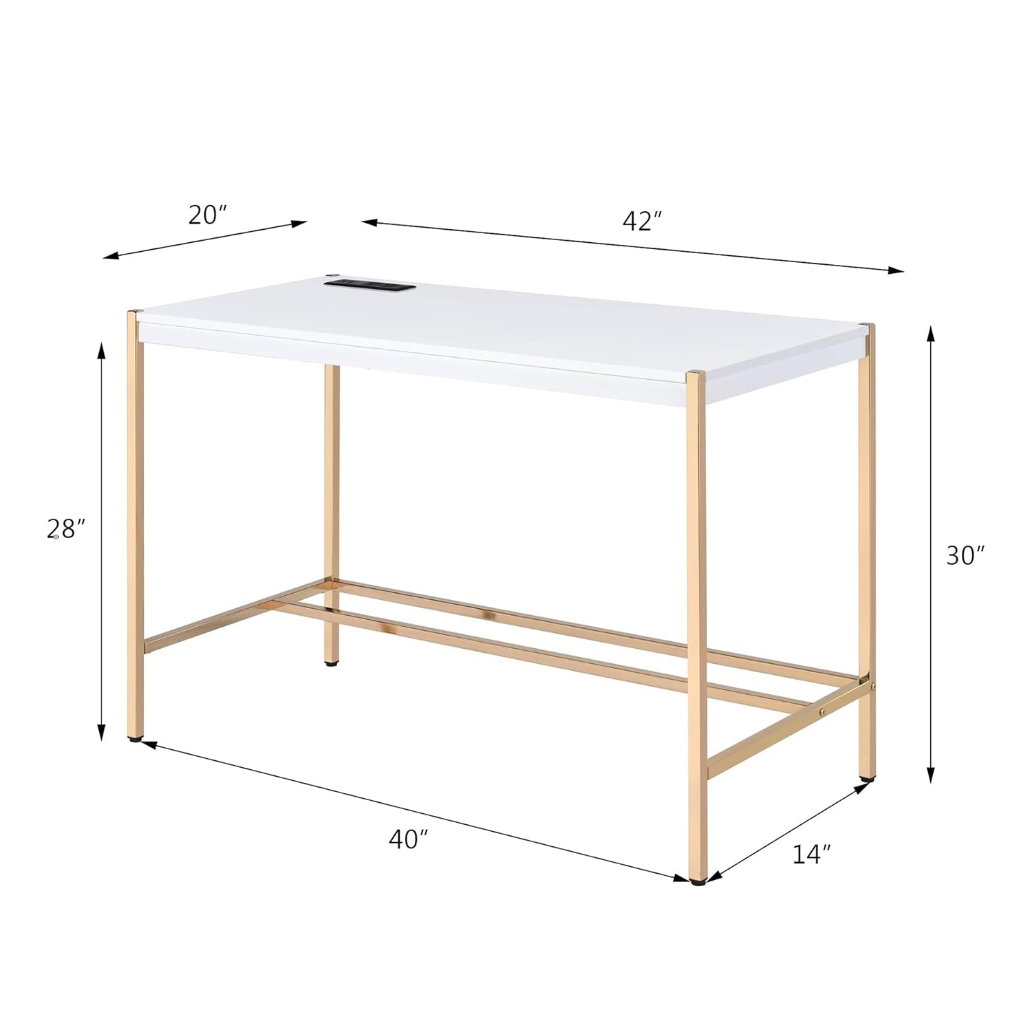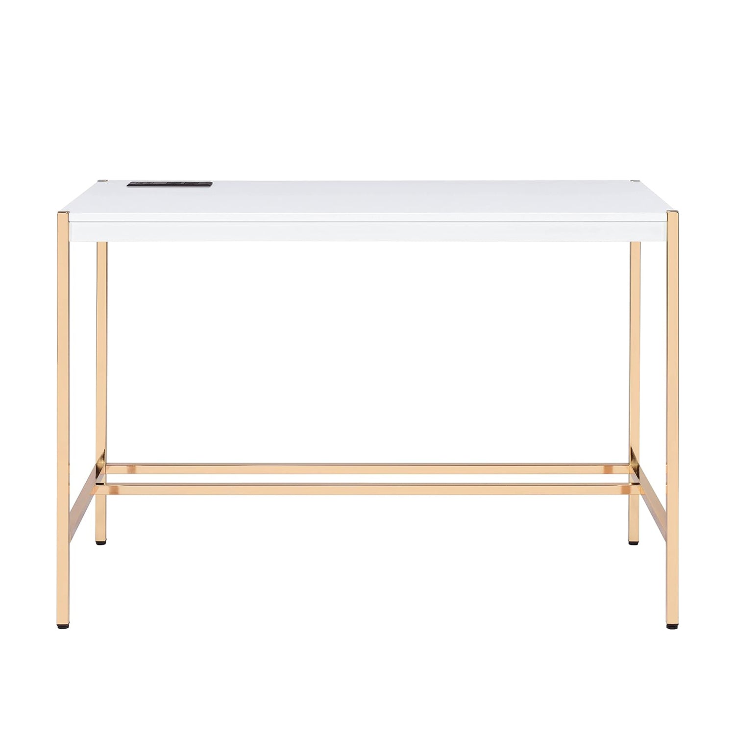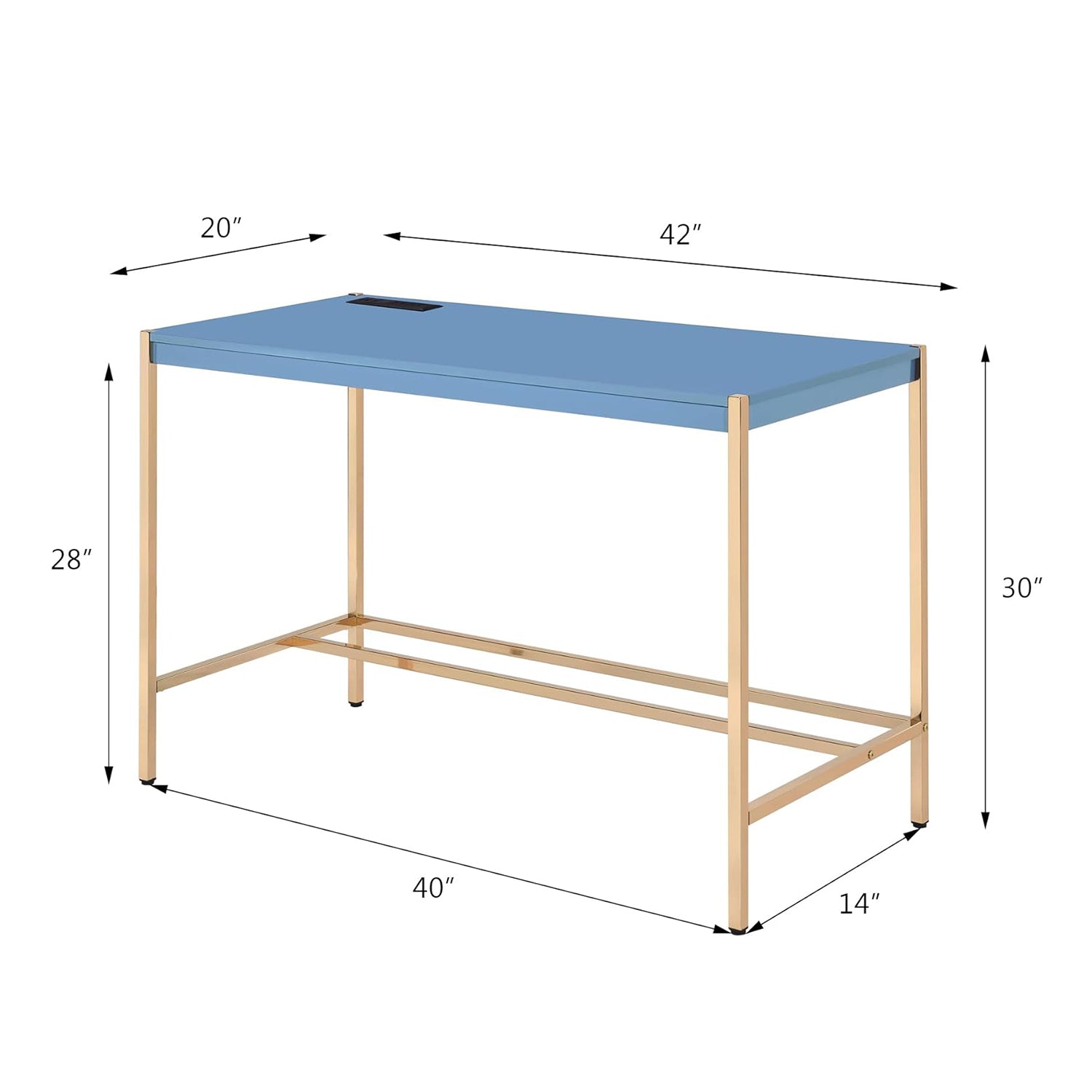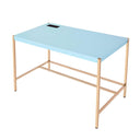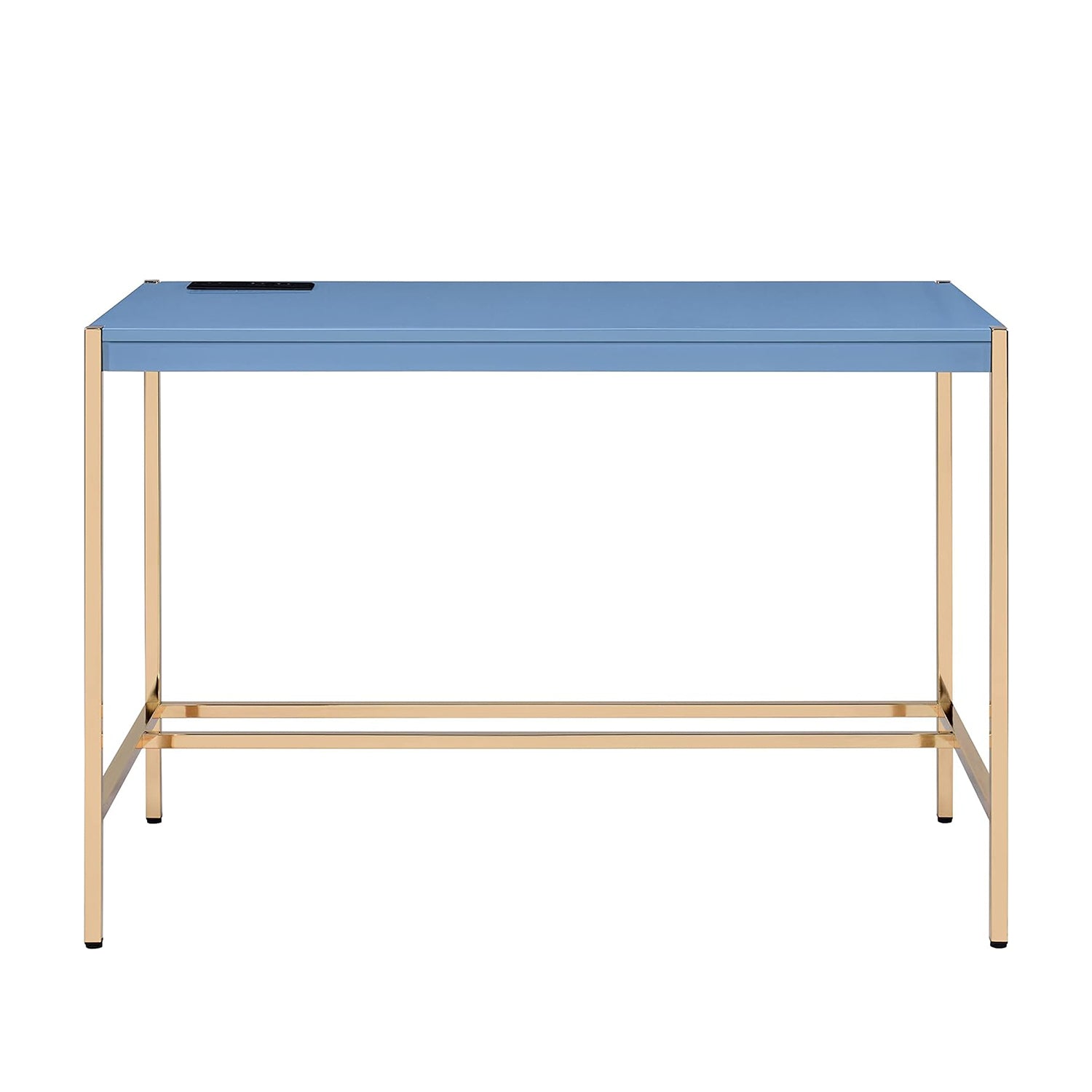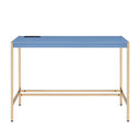 Give your workspace a fresh, stylish update with this baby blue rectangular writing desk accented in gold. Designed for both form and function, it creates a cozy, personal work area with integrated modern conveniences. The clean tabletop and sturdy metal base offer a balanced mix of elegance and practicality, while the built-in USB port keeps devices charged and within reach.