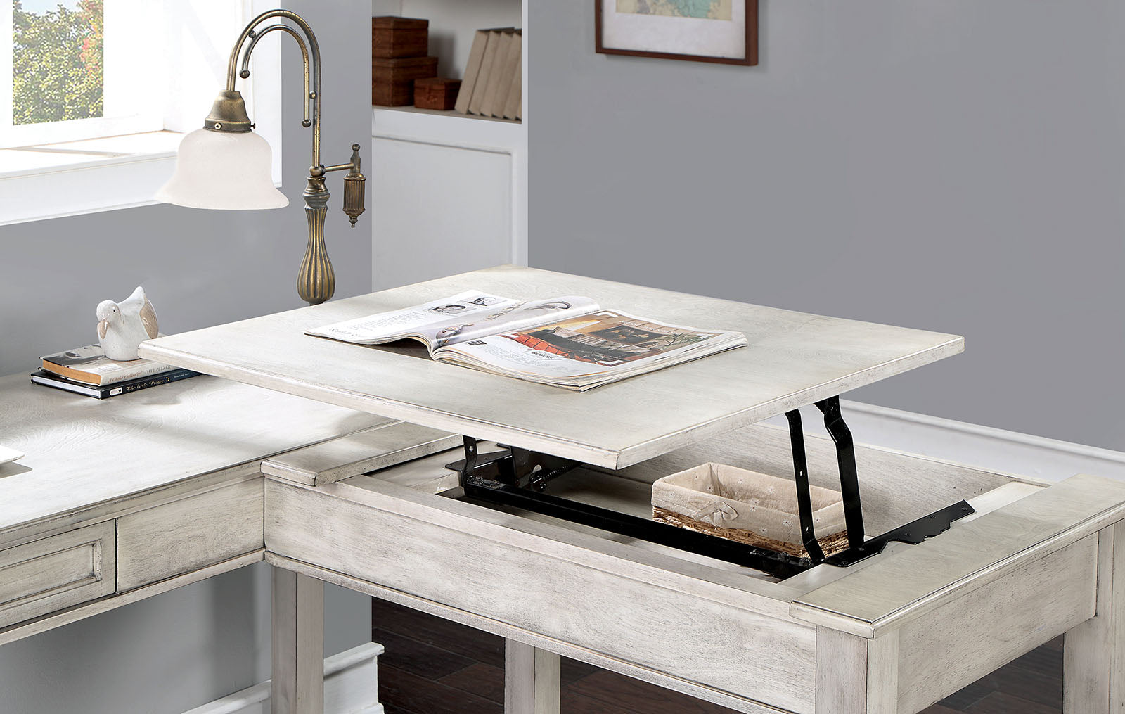 Transform your home office into a stylish, highly functional workspace with this transitional corner computer desk in antique white. Thoughtfully designed for productivity and convenience, it balances classic detailing with modern features like a lift-top work surface and built-in USB/power access so you can work comfortably and stay connected.