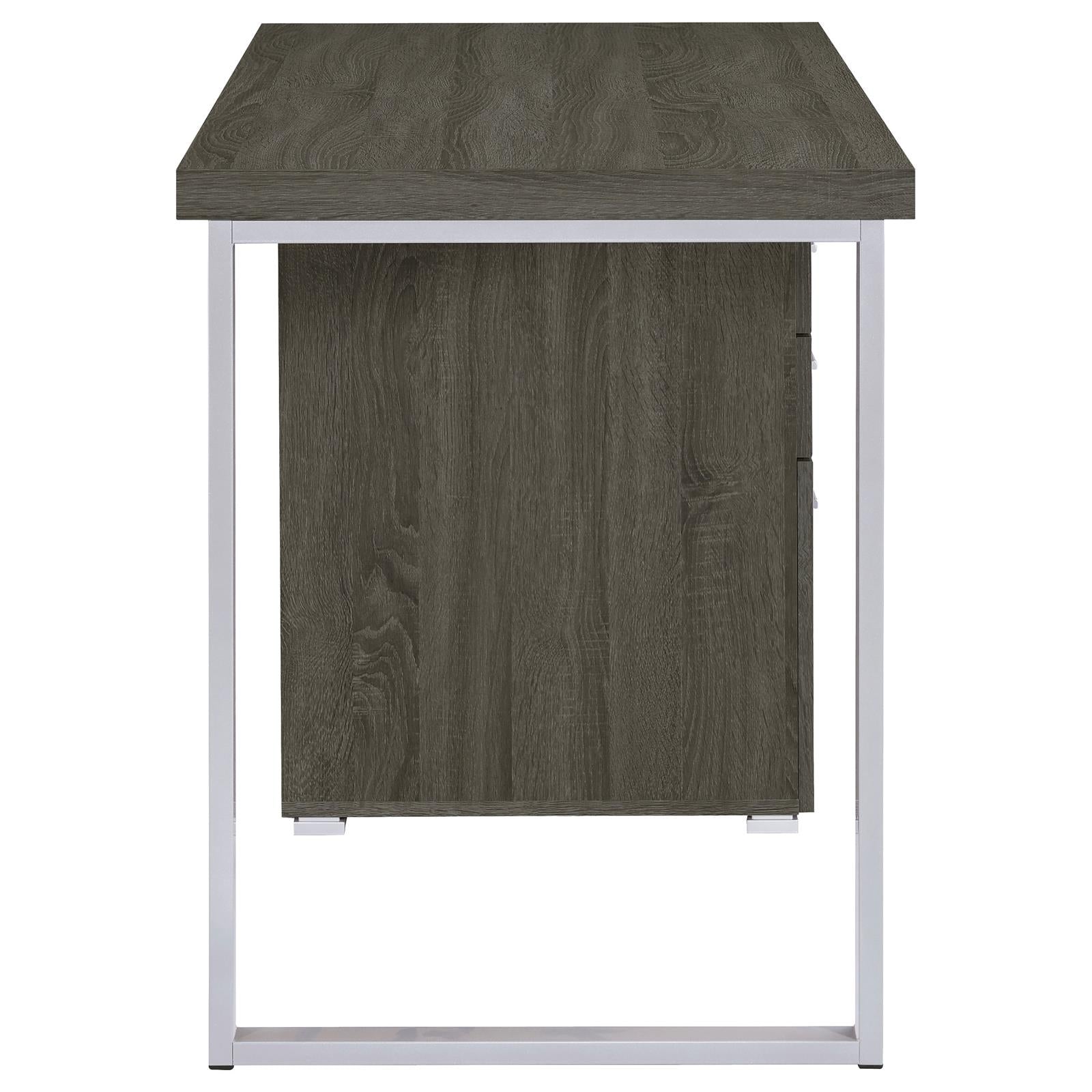 Create a stylish, functional home workspace with this Weathered Grey 3-drawer reversible office desk. Clean lines, a durable veneer finish and contrasting metal legs deliver a modern aesthetic, while thoughtful storage and smooth Euro glides keep your essentials organized and easily accessible. Designed for everyday use, this desk balances form and function for a productive work-from-home setup.