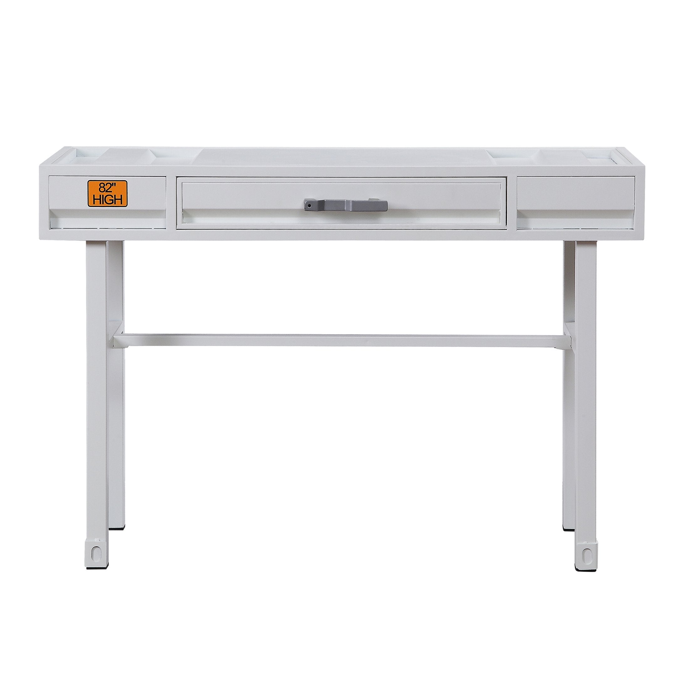 Give your workspace an industrial-meets-modern update with this sleek white writing desk. Designed with cargo-container inspiration, the desk pairs striking recessed-panel styling with practical features—offering a versatile surface for writing, laptops, or creative projects while keeping essentials tucked away in a single, easy-access drawer.