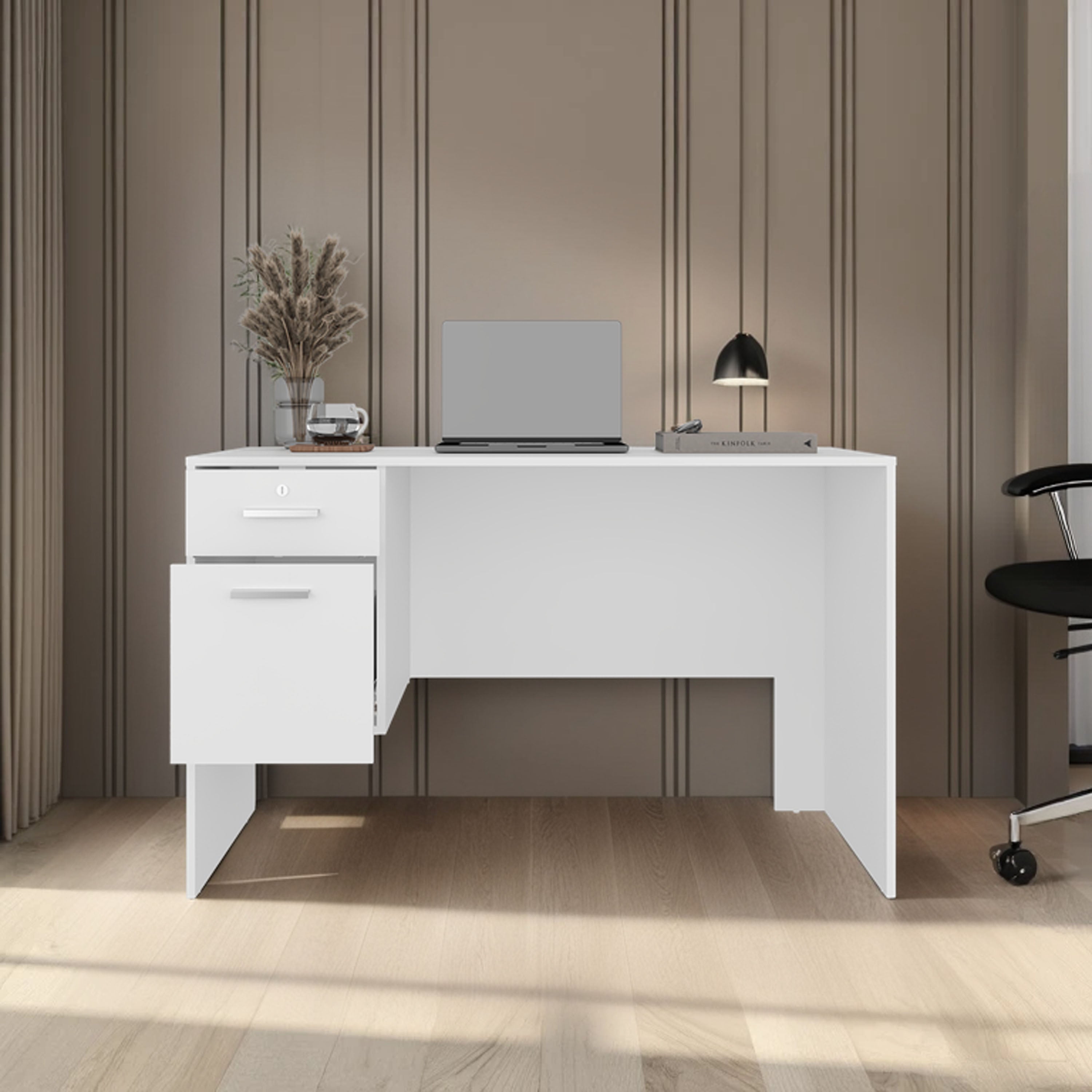 Create a bright, organized workspace with this modern white desk — designed for everyday productivity and secure storage. Its clean rectangular silhouette and durable finish suit home offices, study areas, or shared workspaces, while two spacious drawers and a lockable compartment keep essentials orderly and protected.