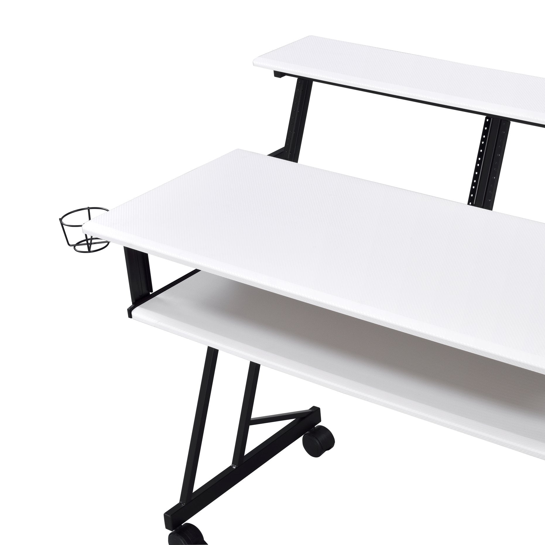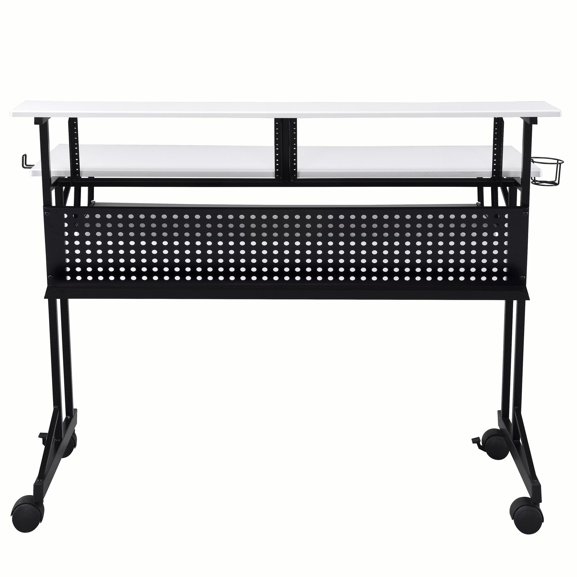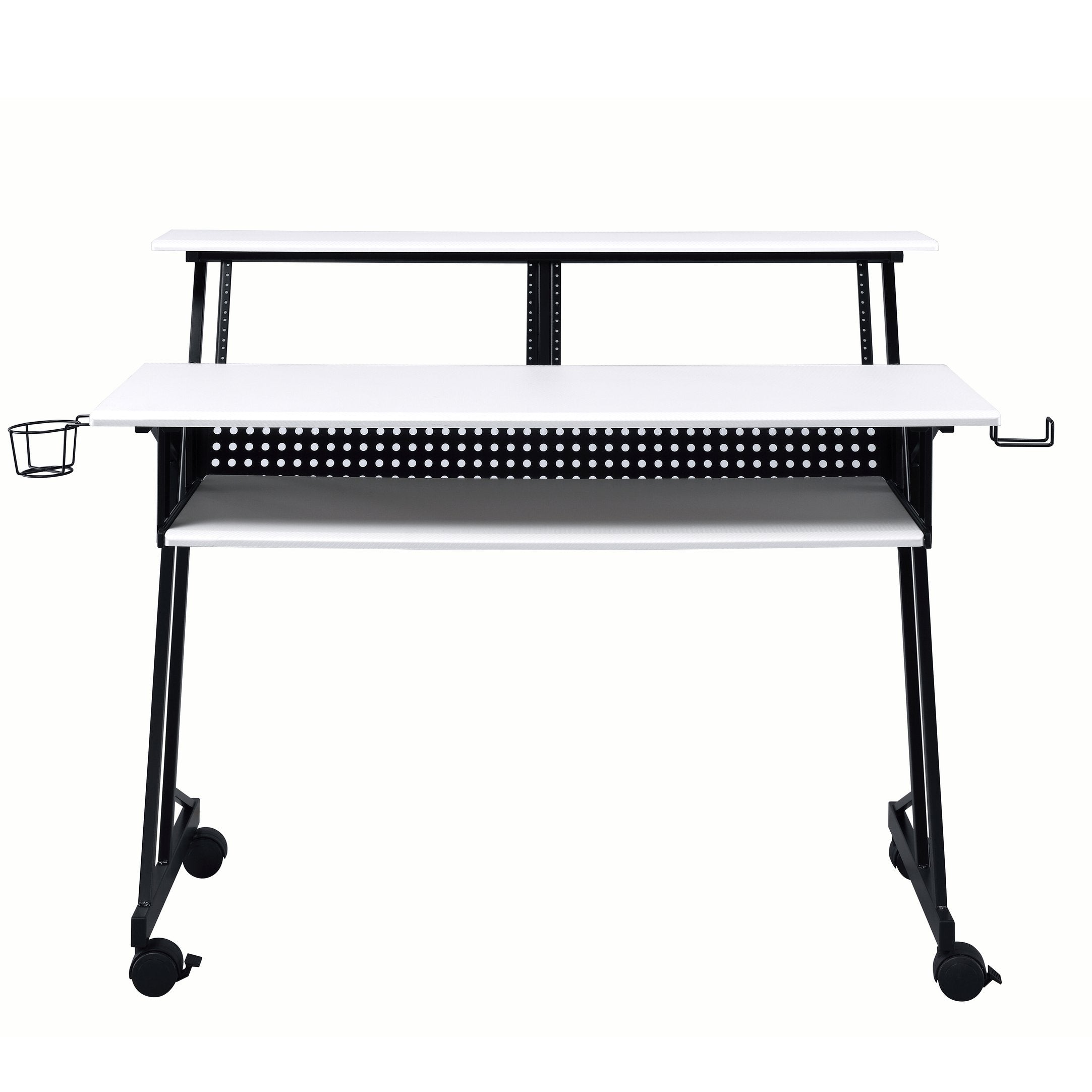 Create a professional, organized workspace for composing, recording, and performing with a purpose-built music studio desk. This compact yet roomy desk pairs a clean white and black finish with a sturdy metal base and smooth caster wheels, delivering stability, mobility, and a contemporary look that fits home studios, rehearsal spaces, or stage setups. Thoughtful storage and surface layout keep your keyboard, mixer, and sheet music within easy reach so you can focus on making music.