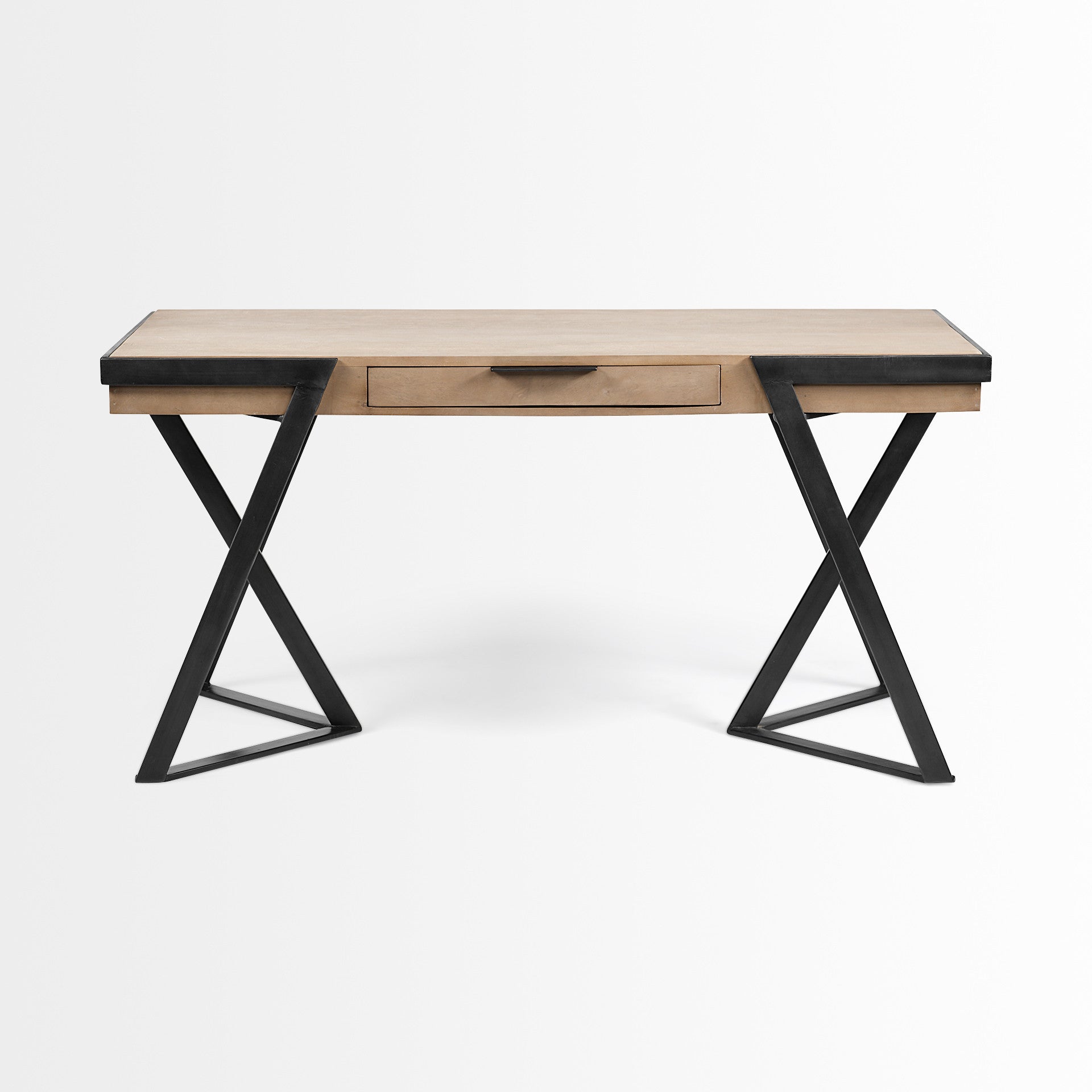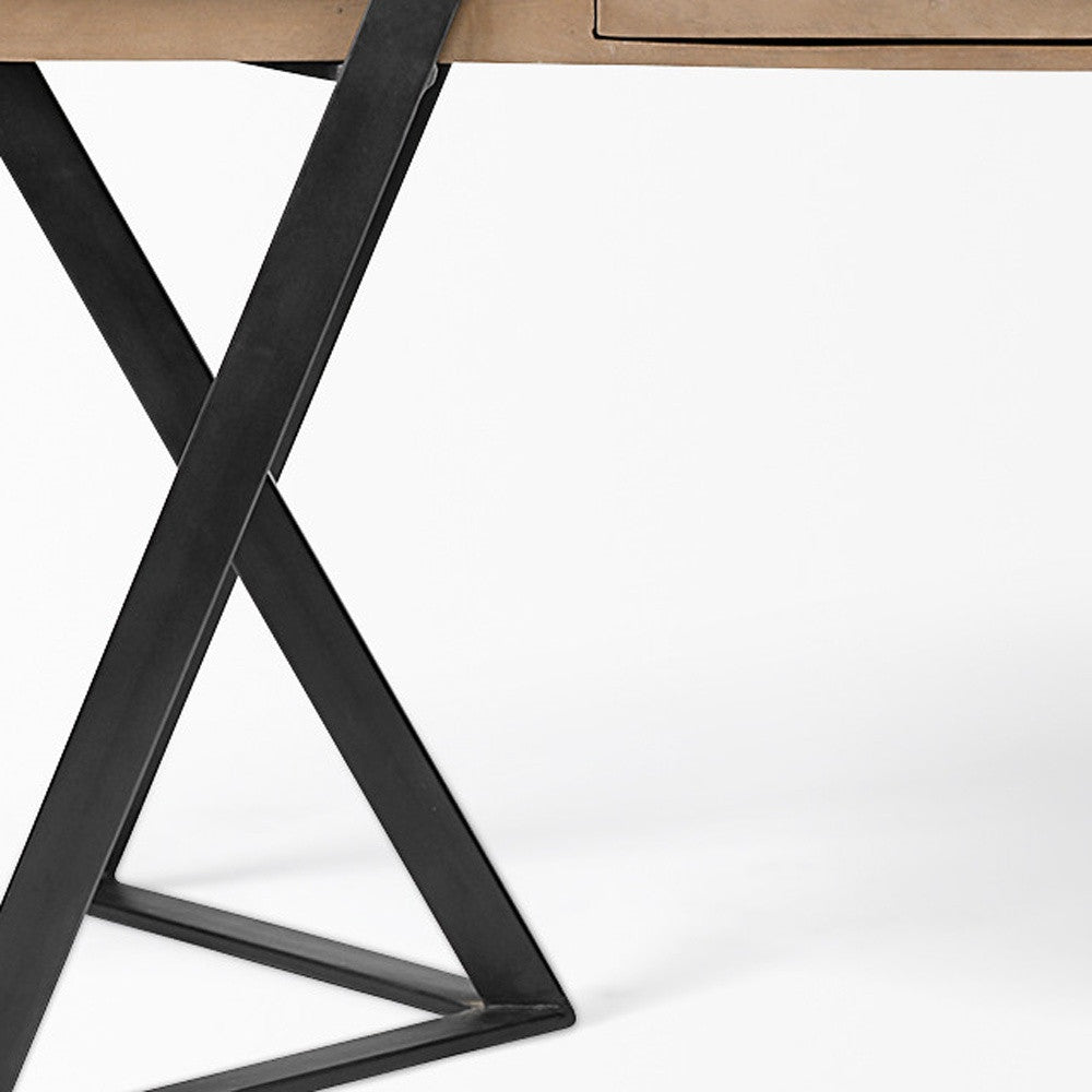 - the solid wood top is mounted atop uniquely designed, triangular legs made of black-toned iron that not only stabilize the desk to perfection but also add to its visual appeal