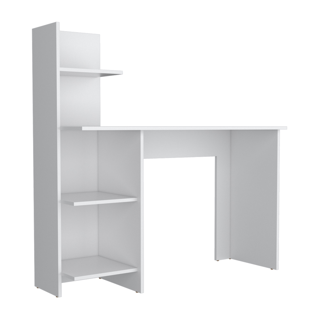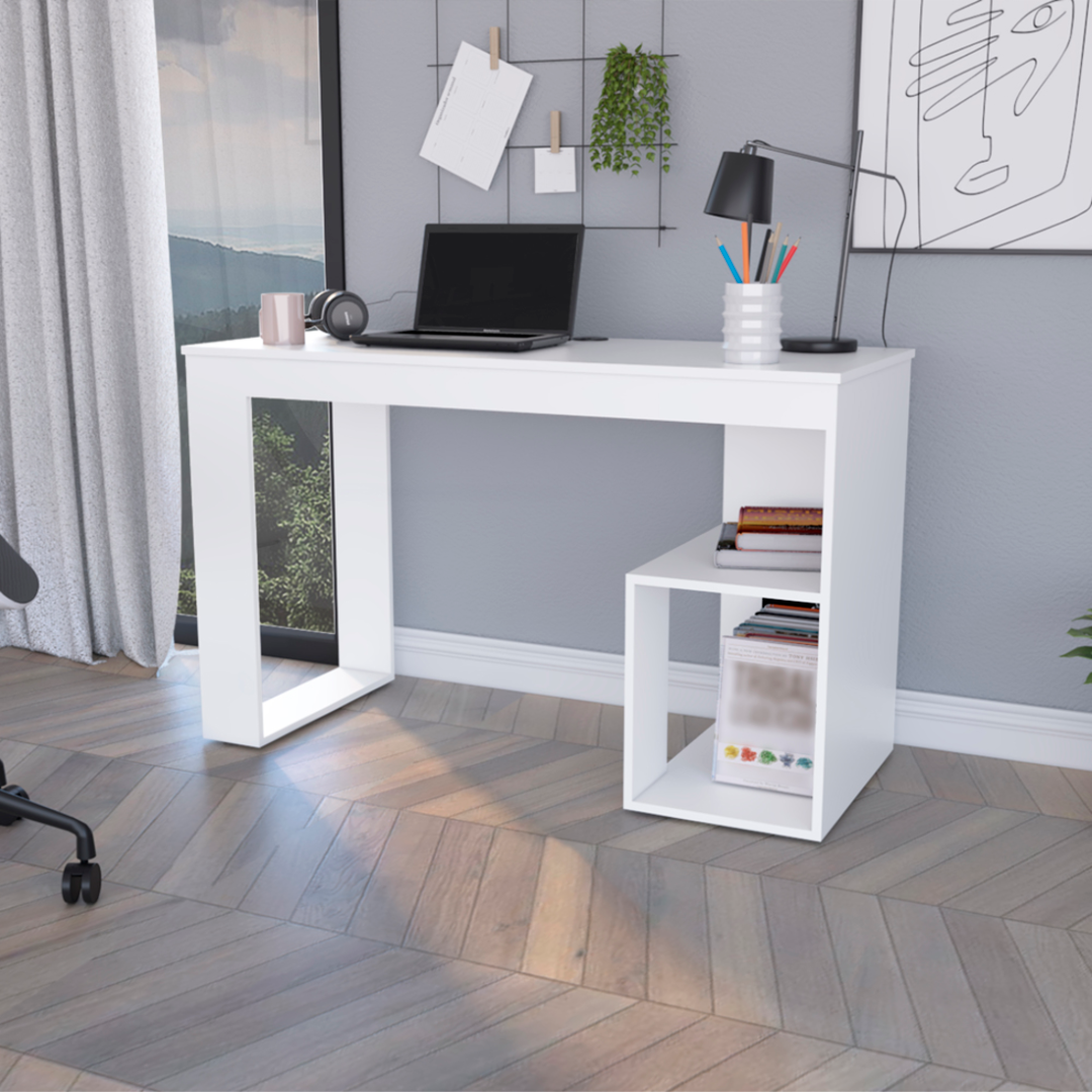 - Modern computer desk includes multiple open shelving cubby spaces for lots of storage and display space.