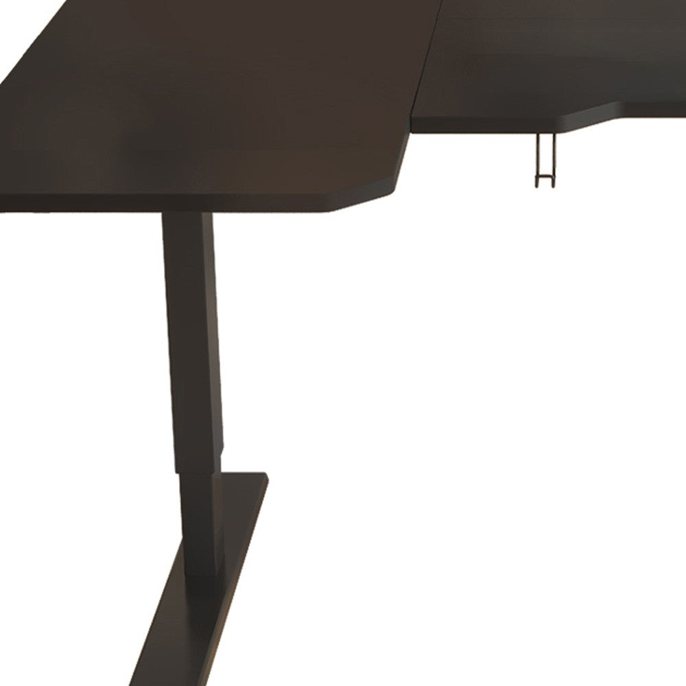 - Modern L shaped desk in black with a sleek stainless steel base.