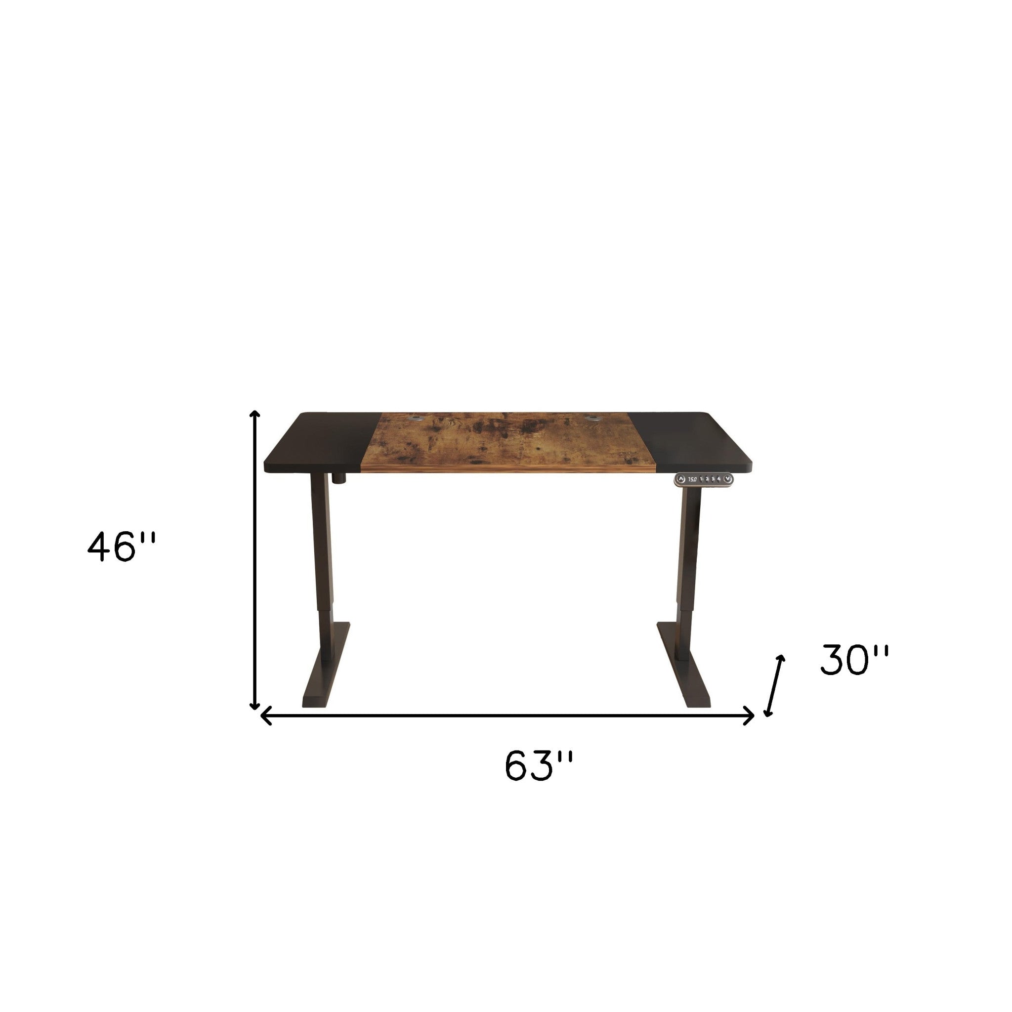 - Rectangular desk with brown and black top.