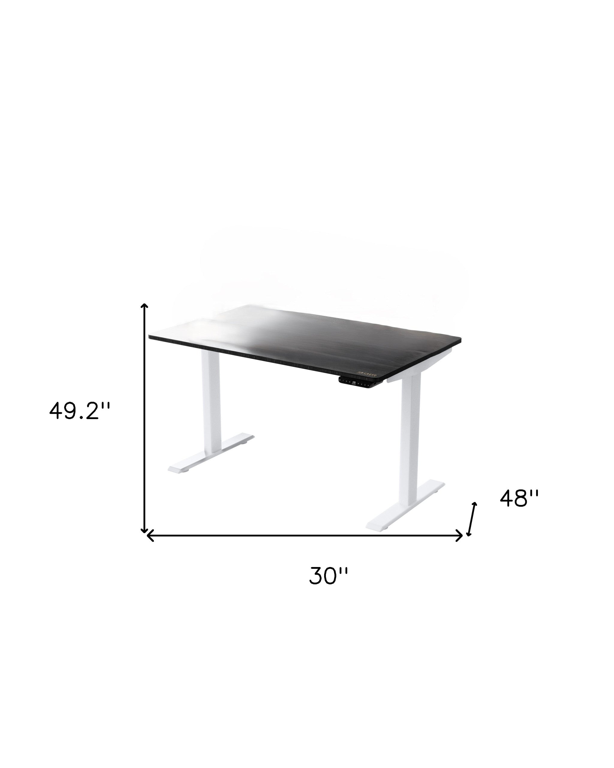 This adjustable height electric desk frame is topped with a beautiful 48x30” black desktop with a premium non-scratch finish that looks great in any office environment.