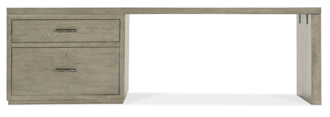 Bring organic warmth and expansive functionality to your workspace with the Linville Falls 96" desk. Crafted from oak veneers and finished in a soft smoked gray Mink, this clean-lined desk combines natural texture with thoughtful storage—ideal for home offices or executive suites where a floating placement is desired. Durable construction, locking file security, and refined metal hardware complete a piece that balances form and function.