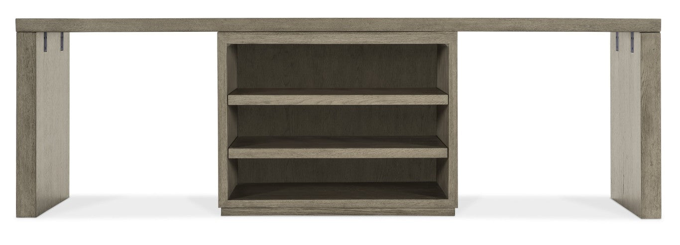 - Storage Configuration: Open desk cabinet on one side with two adjustable shelves for books, files, or decorative storage; opposite side supported by a leg end panel for a balanced silhouette
