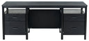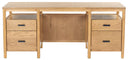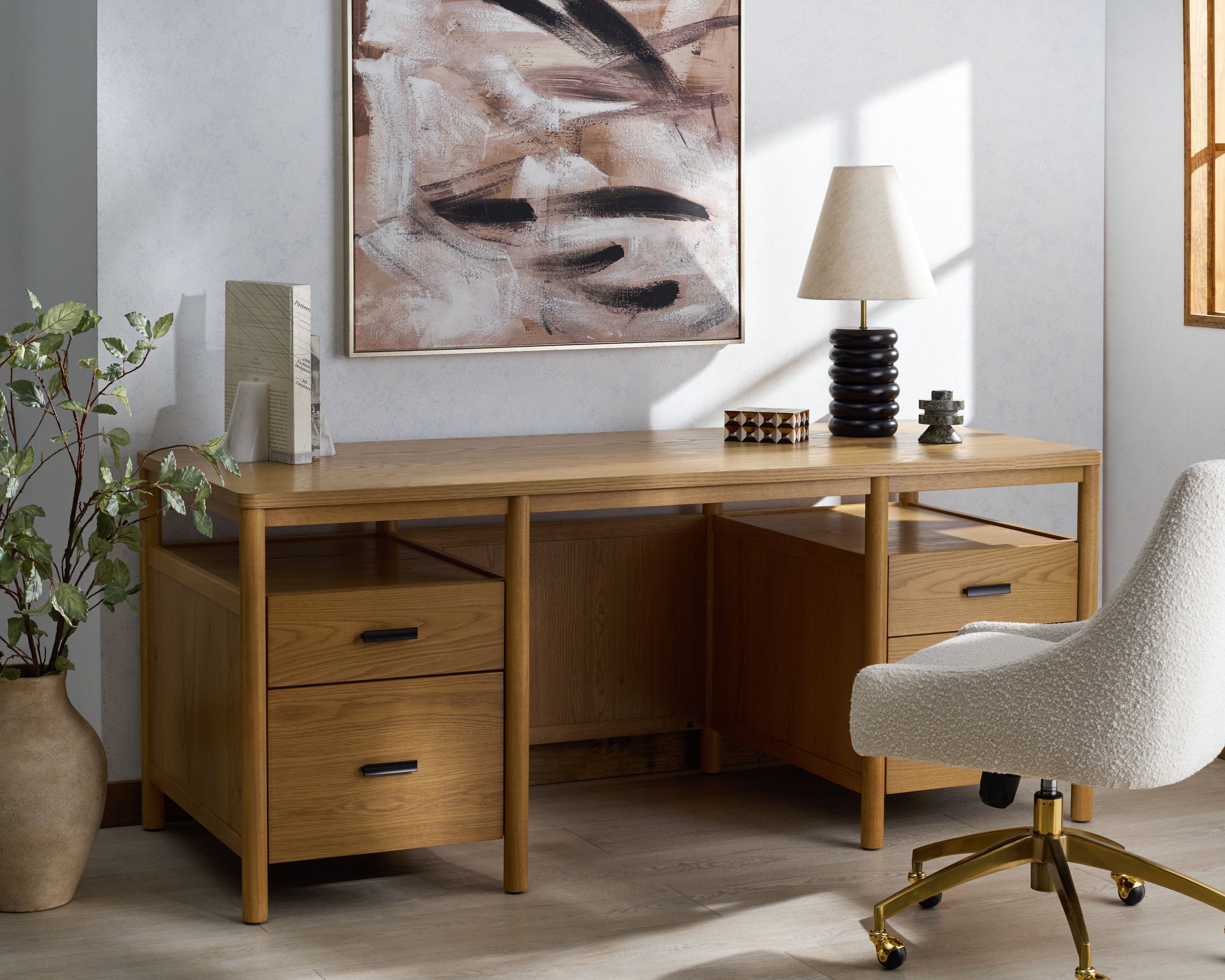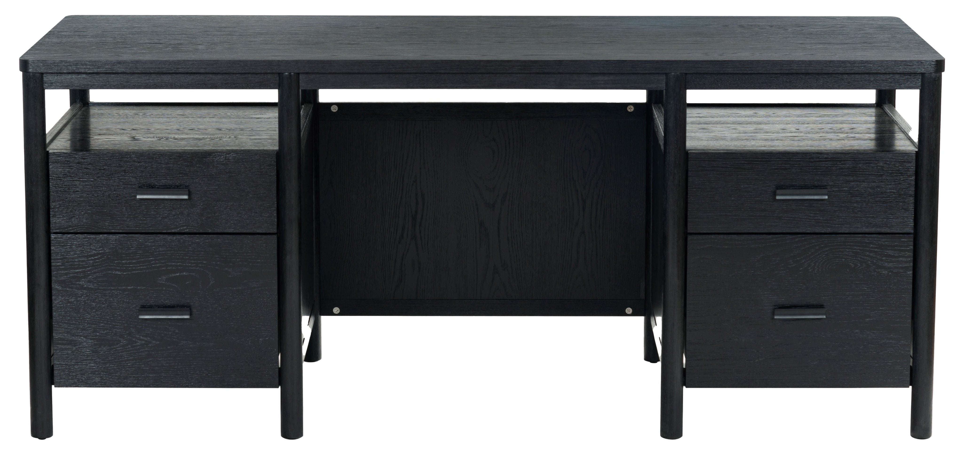 The medium oak finish adds a touch of natural beauty, seamlessly matching various interior designs. The sleek black metal accents provide a modern contrast, making this desk a truly captivating centerpiece. With four spacious drawers, keeping your space organized is simple and efficient.