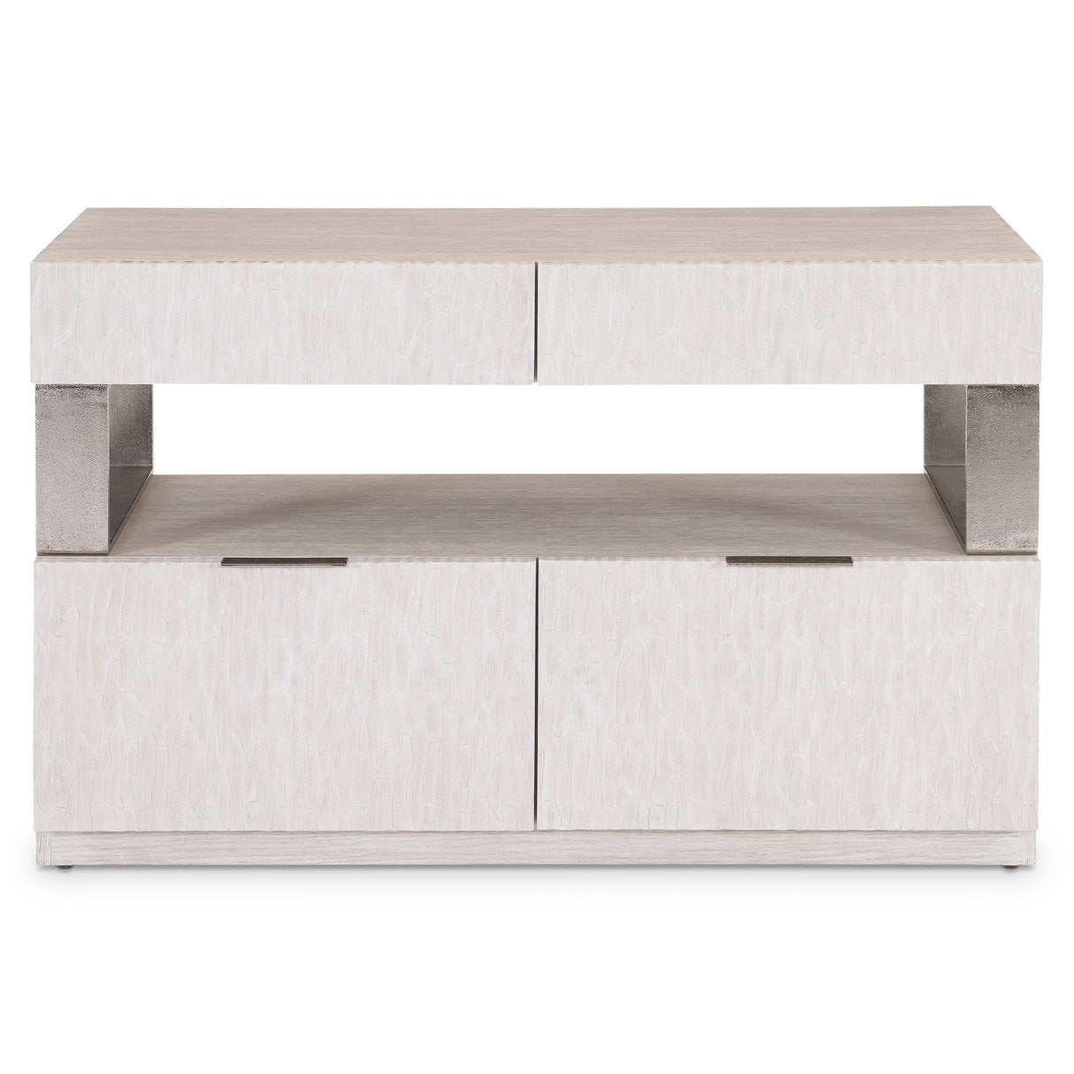 Weathered Bone finished case with cast white chiseled drawer fronts. Four drawers per case - two upper drawers supported by Shiny Nickel finished metal frames on both ends, and two lower drawers below a fixed shelf surface. Two upper drawers have finger pulls across the top. Two lower file drawers have metal tab pulls and removable hanging file rods included for letter or legal files. Wood plinth base with adjustable glides. Anti-tip kit and instruction sheet.