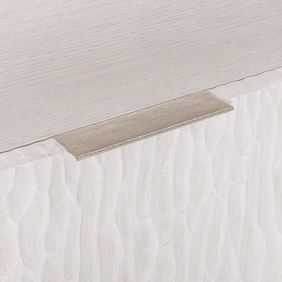 - Finish & Materials: Quartered white oak veneers in Weathered Bone with chiseled cast resin drawer fronts and shiny nickel-finished metal accents.