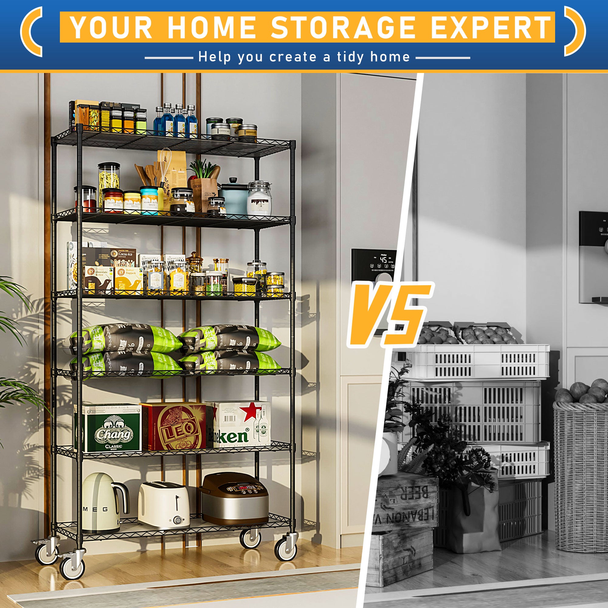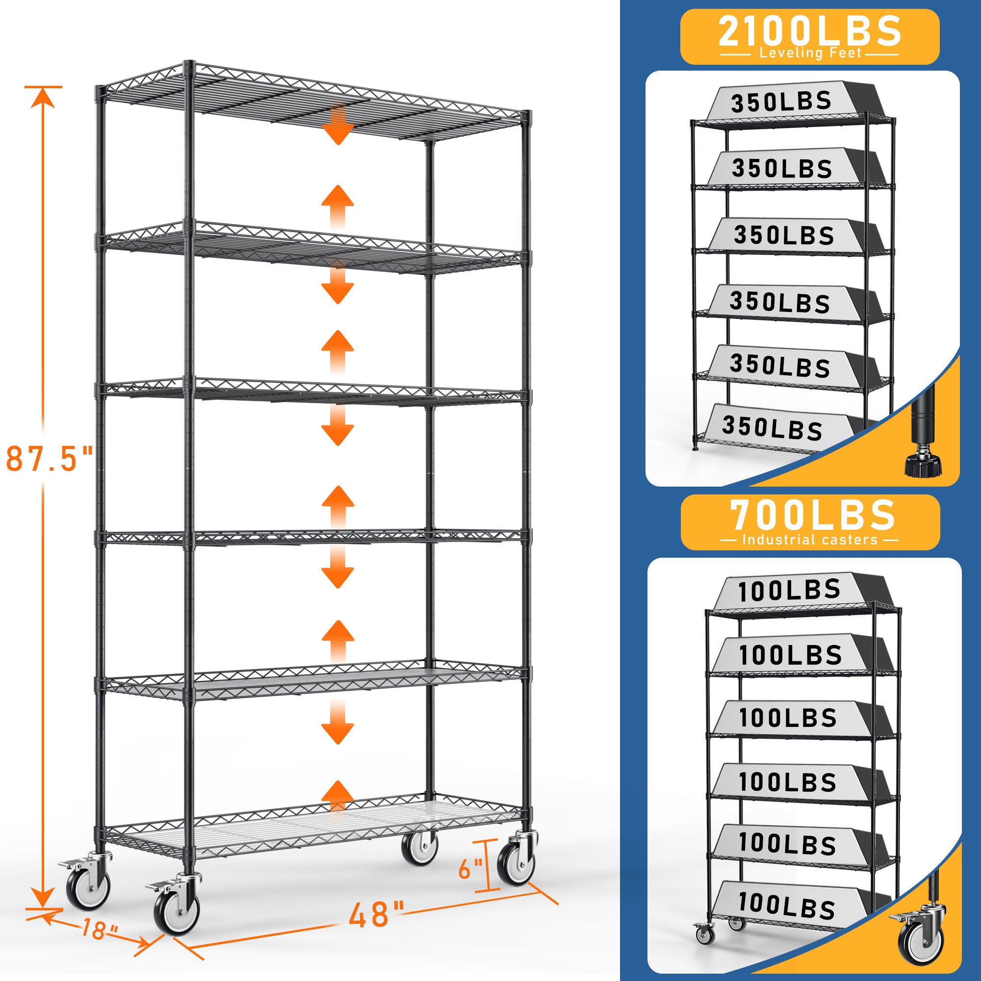 - Substantial Load Capacity: Each shelf of this 6-tier wire shelving unit boasts an impressive load capacity of 350 pounds when the weight is evenly distributed. This makes for a total maximum load capacity of 2100 pounds, offering robust support for heavy-duty storage needs.
