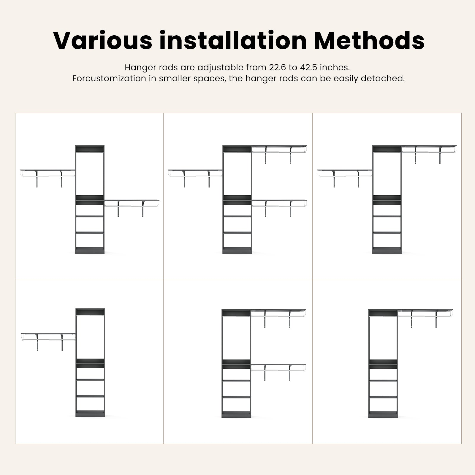 - Flexible & Expandable Design: With 3 expandable hanger rods that adjust from 22.6 inches to 42.5 inches, the Closet Organizer and Storage System offers maximum versatility. This design allows you to effortlessly accommodate a variety of garments, from long coats to everyday wear, making it an ideal choice for any closet space or style.