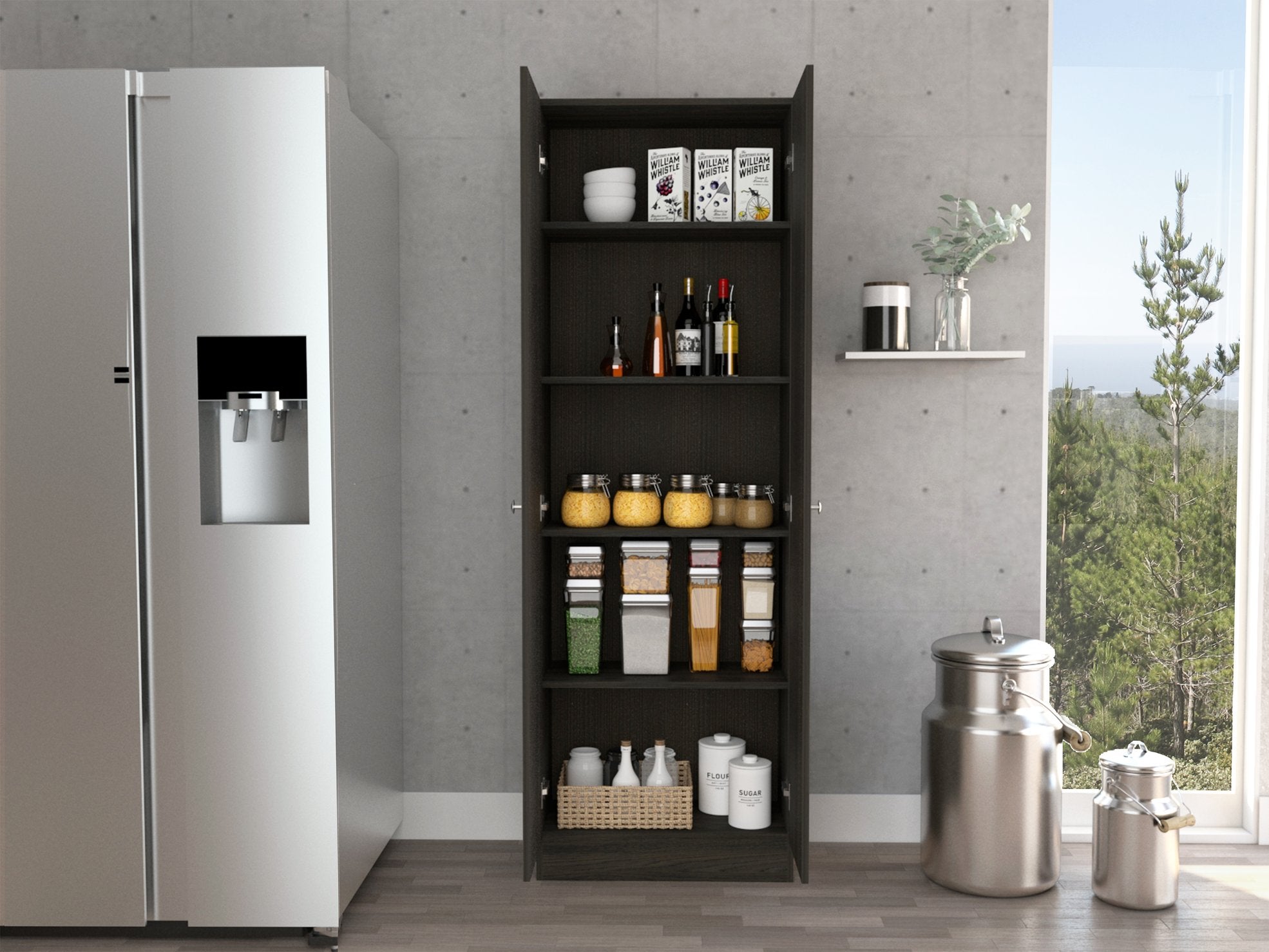Keep your home organized with this tall, versatile pantry cabinet designed for maximum storage in a compact footprint. Finished in rich dark brown with black accents, the cabinet blends modern style with practical features—ideal for kitchens, laundry rooms, garages, or living spaces that need tidy, accessible storage.