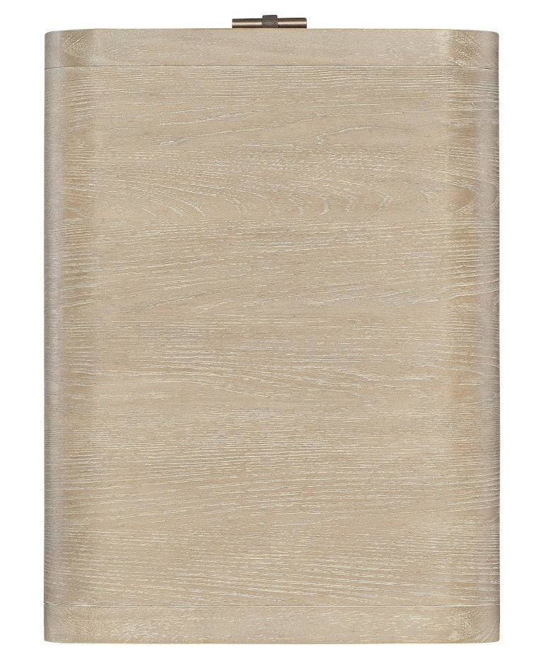 - Two-tone finish pairs soft, elm veneers in a pebble hue with drawer fronts in a contrasting ivory with leathered texture.