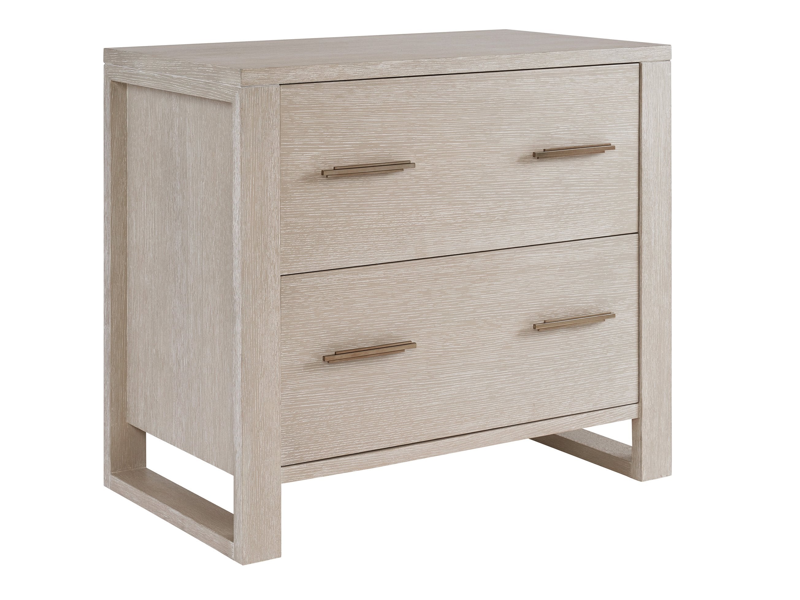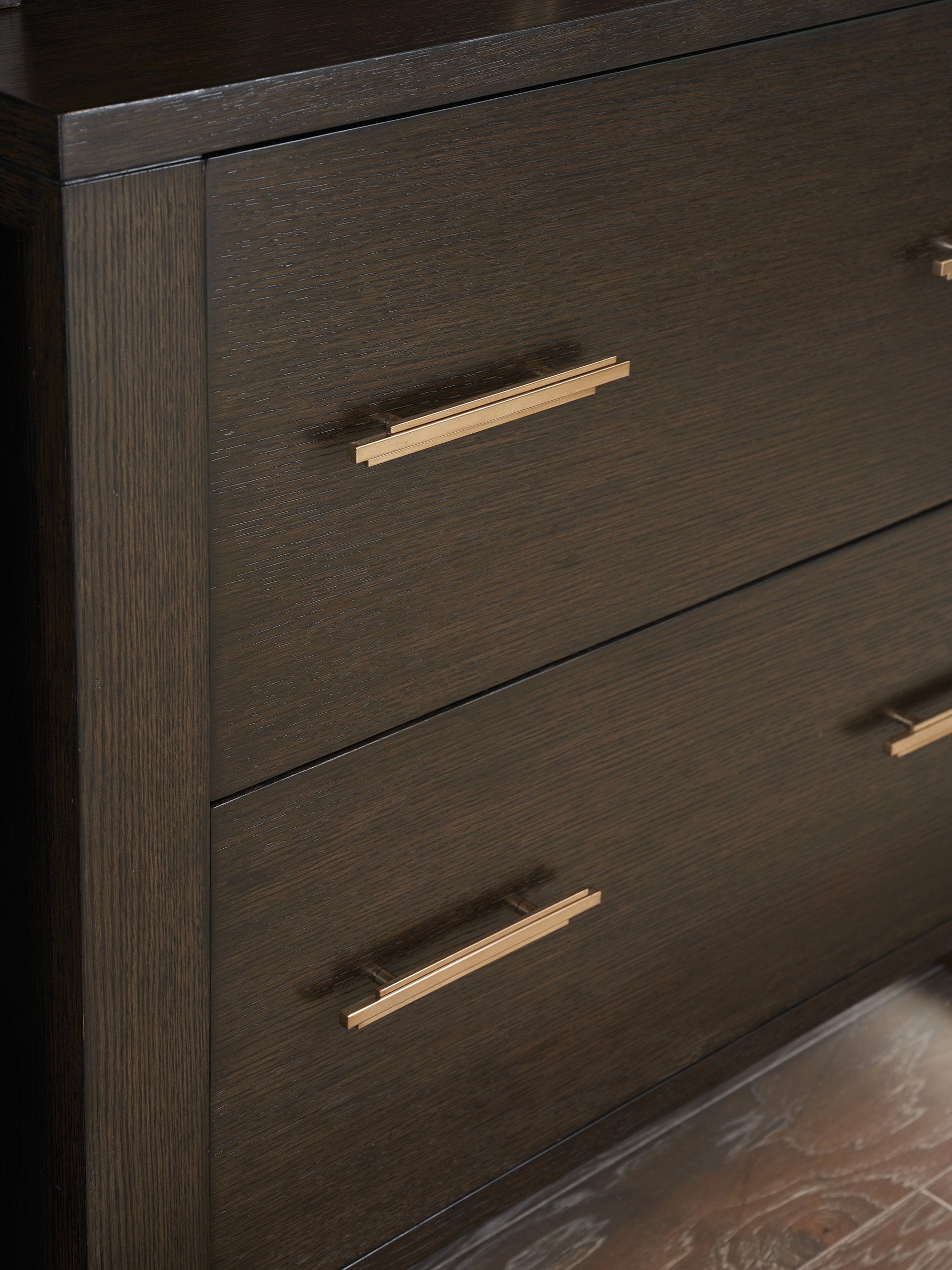 - Custom-designed linear drawer pulls finished in an elegant champagne color