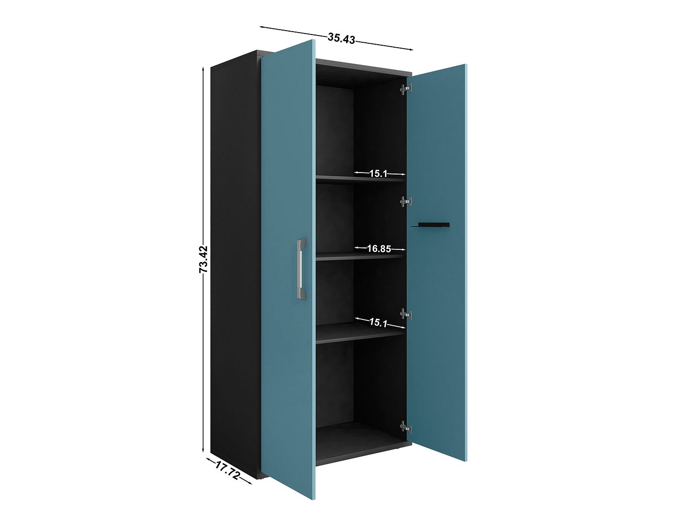 - Tall Cabinet Measures: 35.43 in. Length, 73.43 in. Height, 17.72 in. Depth. Floating Cabinet Measures: 28.35 in. Length, 25.59 in. Height, 14.96 in. Depth. Mobile Cabinet Measures: 28.35 in. Length, 34.41 in. Height, 17.72 in. Depth.