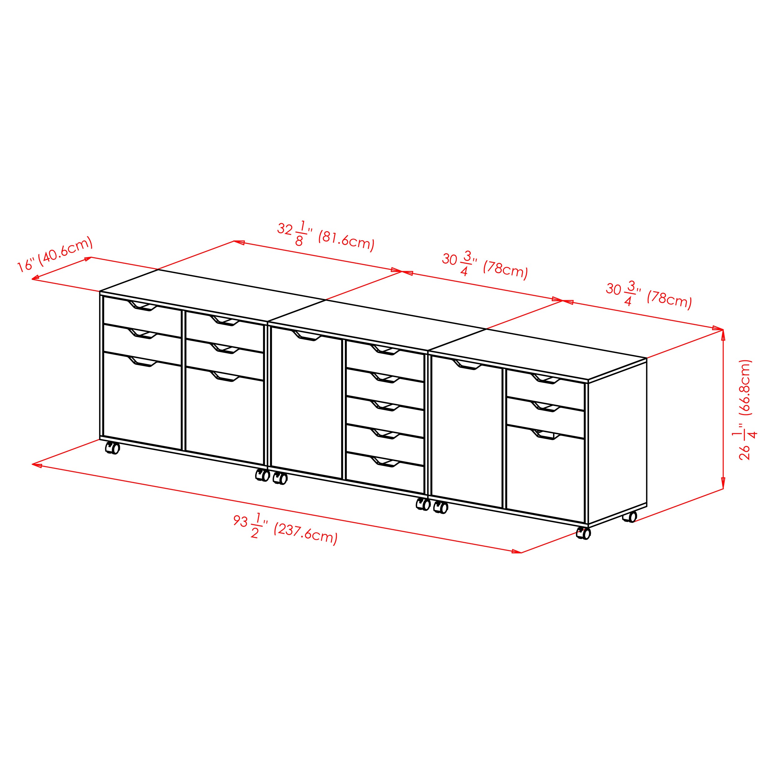 - 3-Piece cabinet set with distinct, matching modules on wheels with 2 locking casters