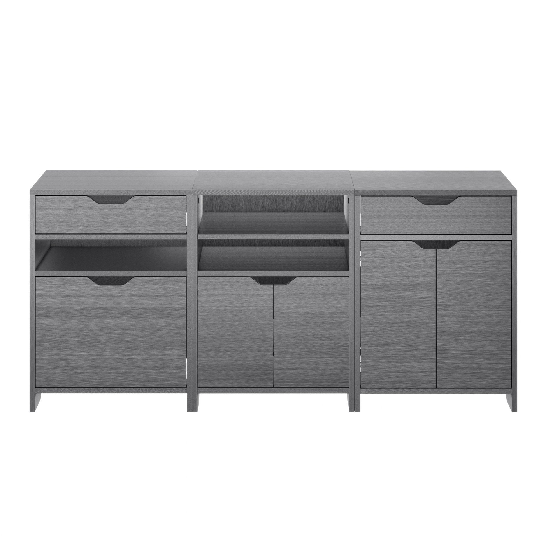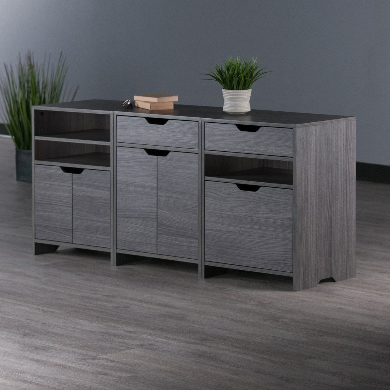 Maximize your storage in style with the 3-Piece Nova Storage Cabinet set. Each unit is distinct, offering a versatile set-up for a home office, craft room, finished basement, or in the kids' rooms, wherever you'd like to see great organization with a contemporary vibe. Finished in a polished wood-grained Charcoal finish, the shelving in the cubbies and cabinets are adjustable or removable, and the File Cabinet unit is adaptable for either legal or letter-size files.