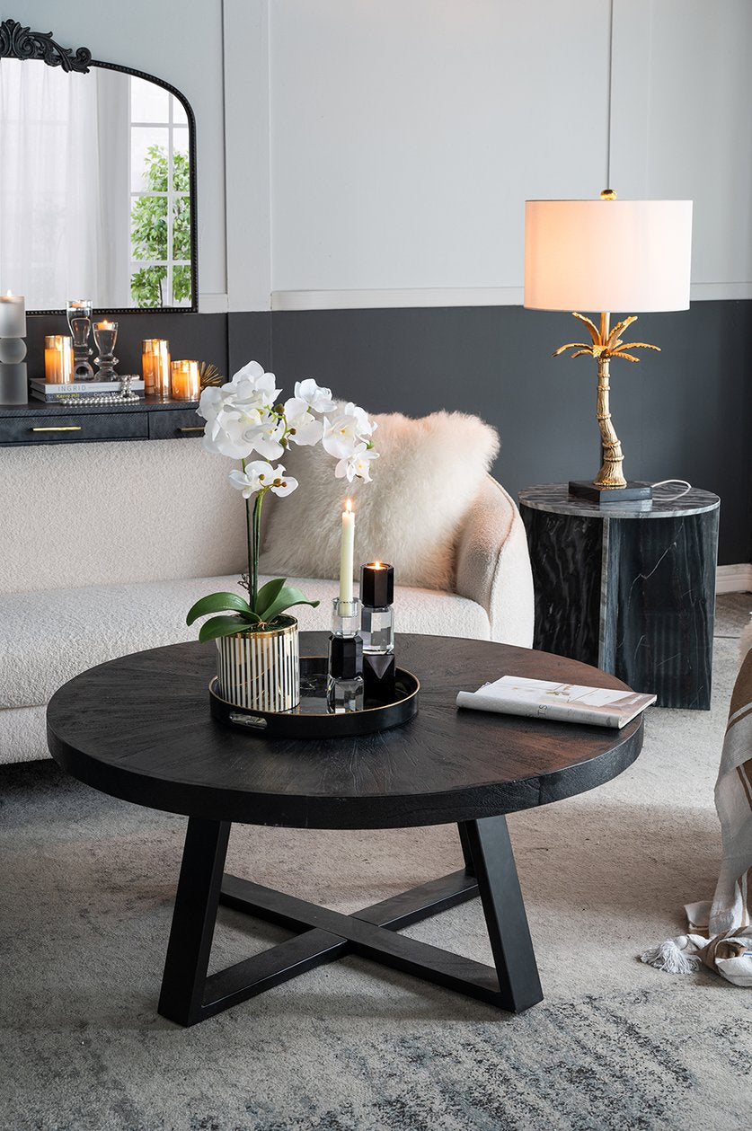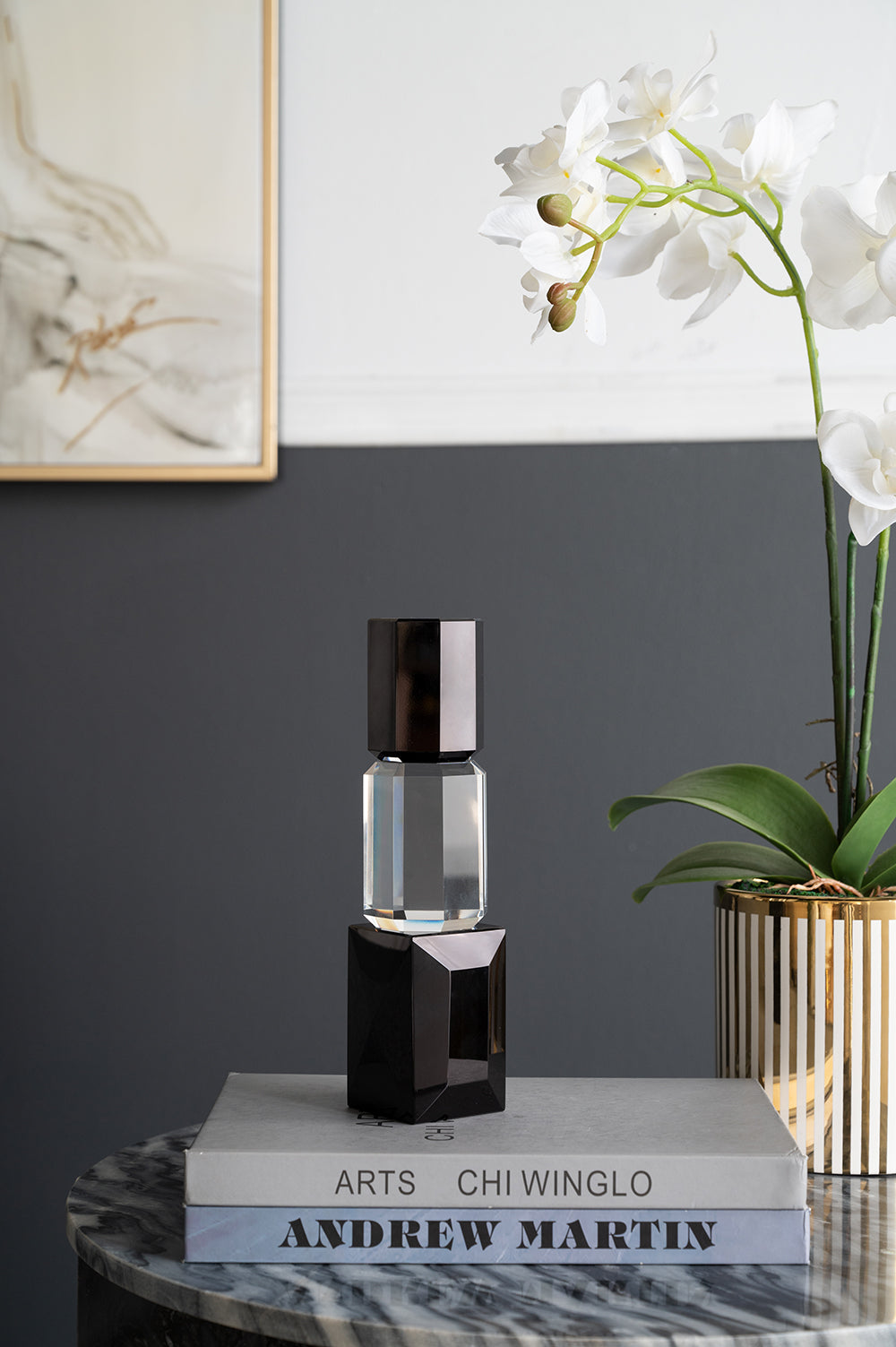 - Distinctive color blocking: clear glass paired with bold black accents for a modern, sculptural look