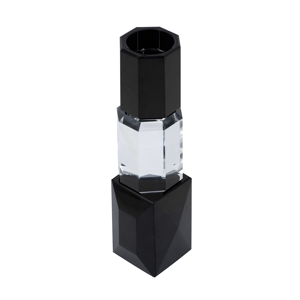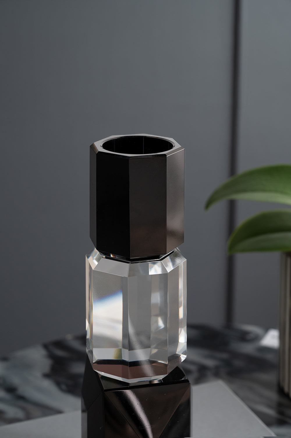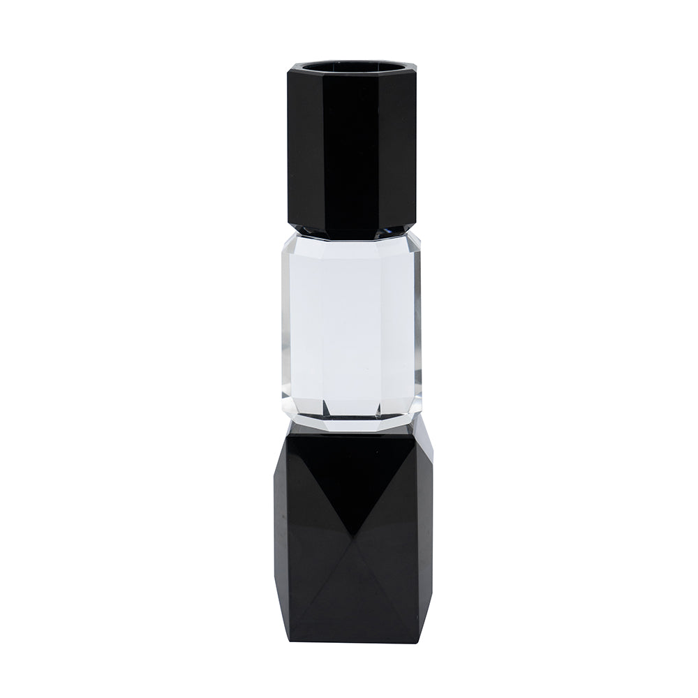 - With its bold blend of clear and black colors, intriguing geometric silhouette, and premium glass construction, this decorative candle holder embraces the beauty of minimalist designs.