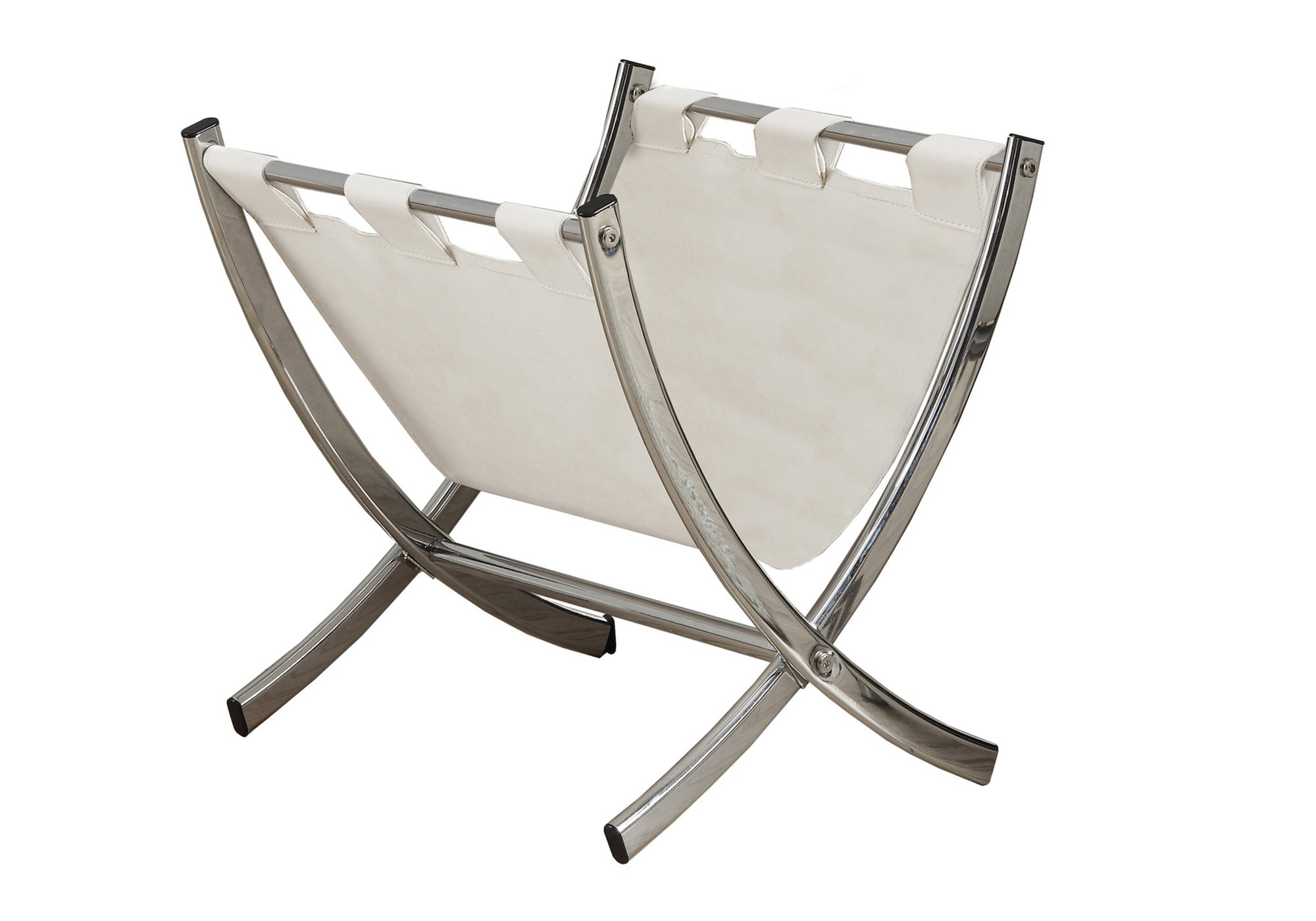 Keep magazines, newspapers and books neatly organized while adding a contemporary accent to any room. This freestanding magazine rack pairs a white leather-look sling with a chrome metal frame for a modern, space-saving solution that works in living rooms, offices, bedrooms, bathrooms or dens. Its open design keeps contents visible and accessible while the sturdy frame prevents slipping and protects floors.