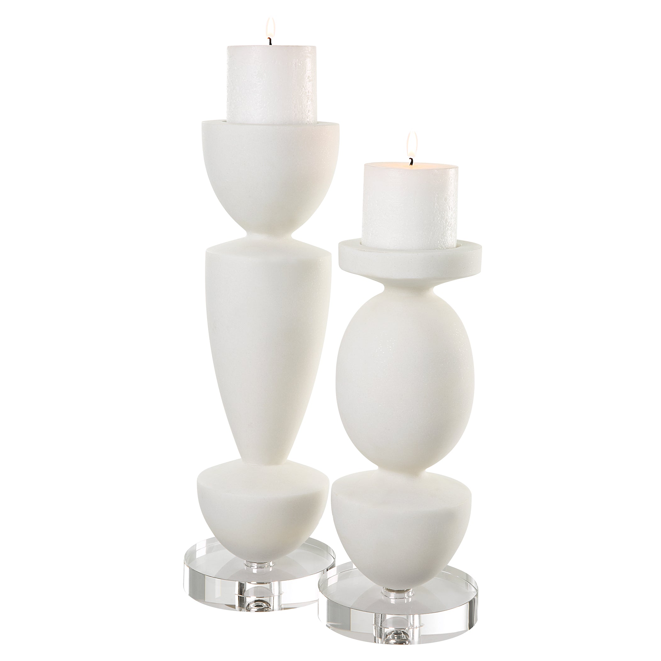 - Finish/Frame Description: Sculptural Candle Holders Crafted From Ivory Man-made Stone That Accurately Replicates The Look Of Thassos Marble And Is Accented By An Elegant Crystal Foot. Includes Two, 3x3 Distressed White Candles. Sizes: S-5x12x5, L-5x16x5