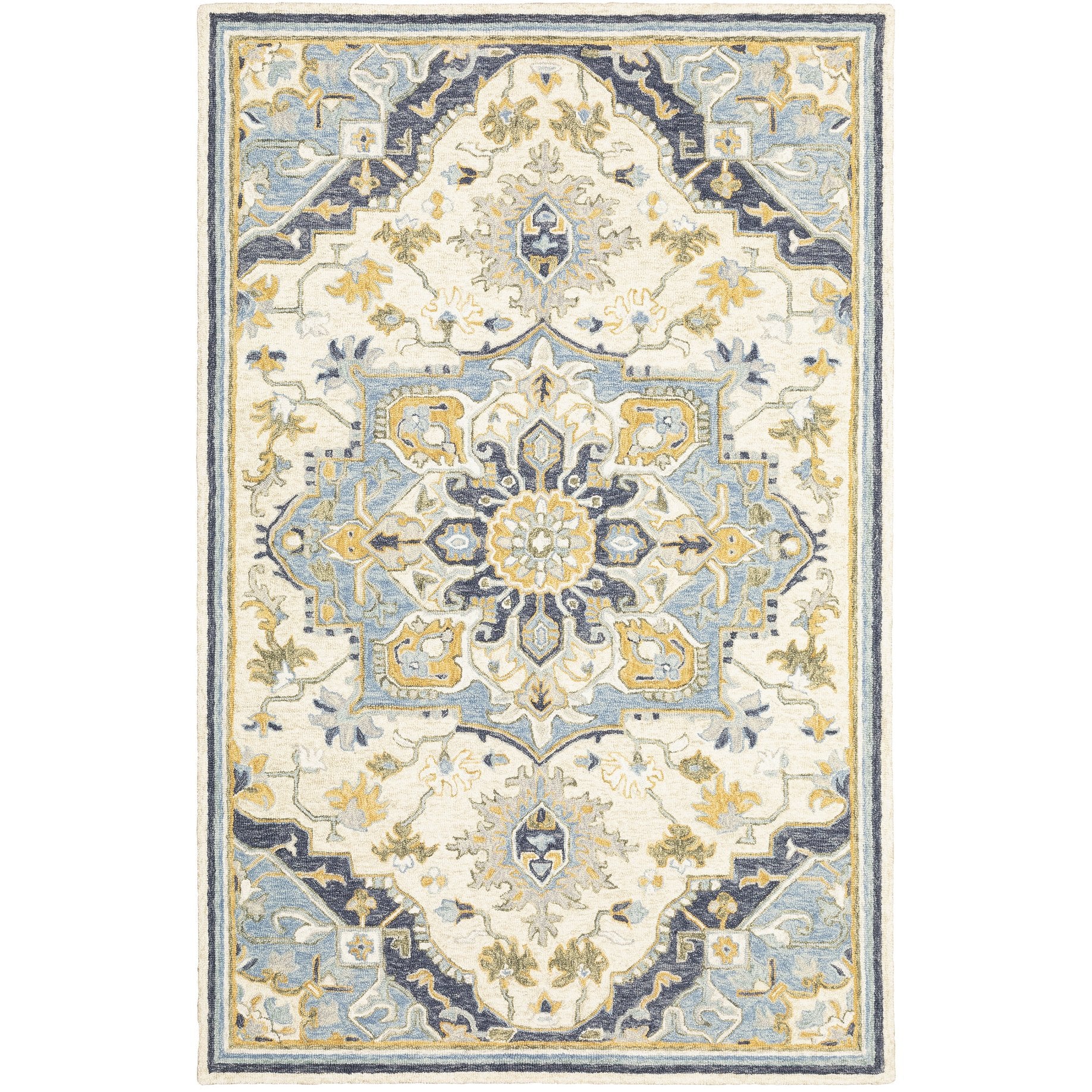 - Rug colors include muted shades of blue and green with ivory