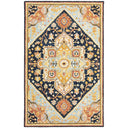 - Rug colors include navy, rust with accents of muted blue, ivory and gold