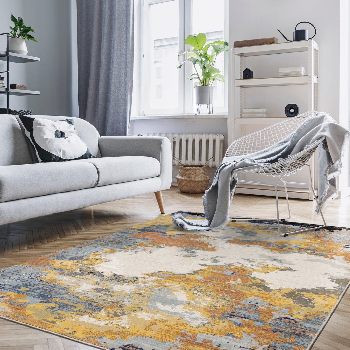 - Rug colors include shades of yellow, gold, blue, grey, brown and beige