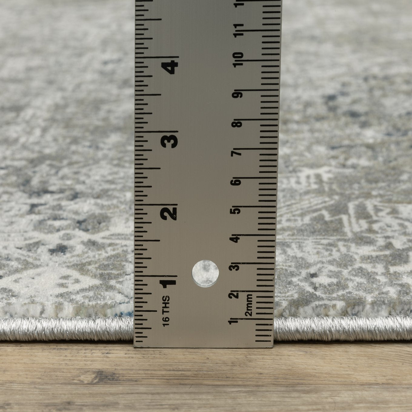 - Rug colors includes shades of ivory, grey, blue, and taupe