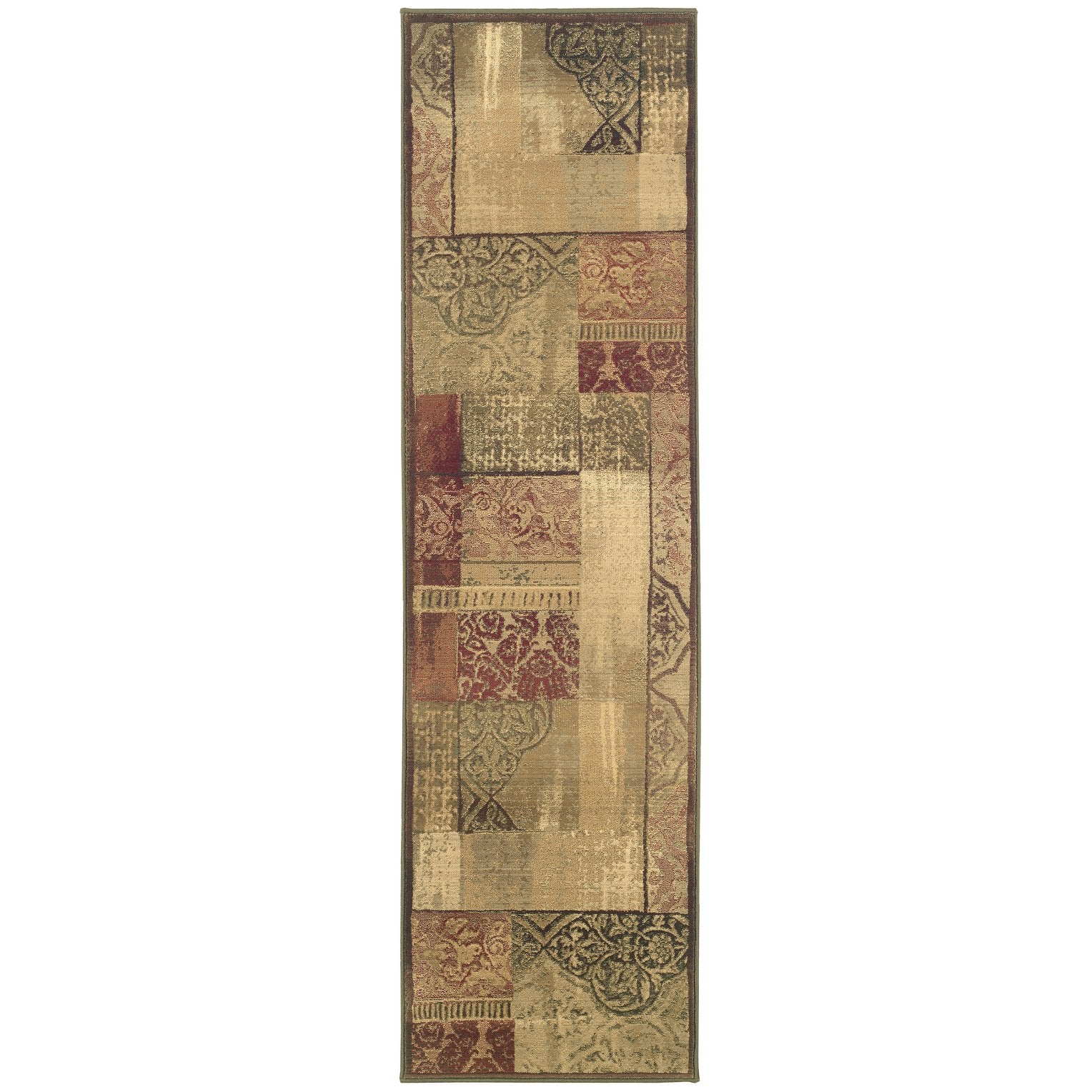 - Rug features shades of green, beige, red, and gold
