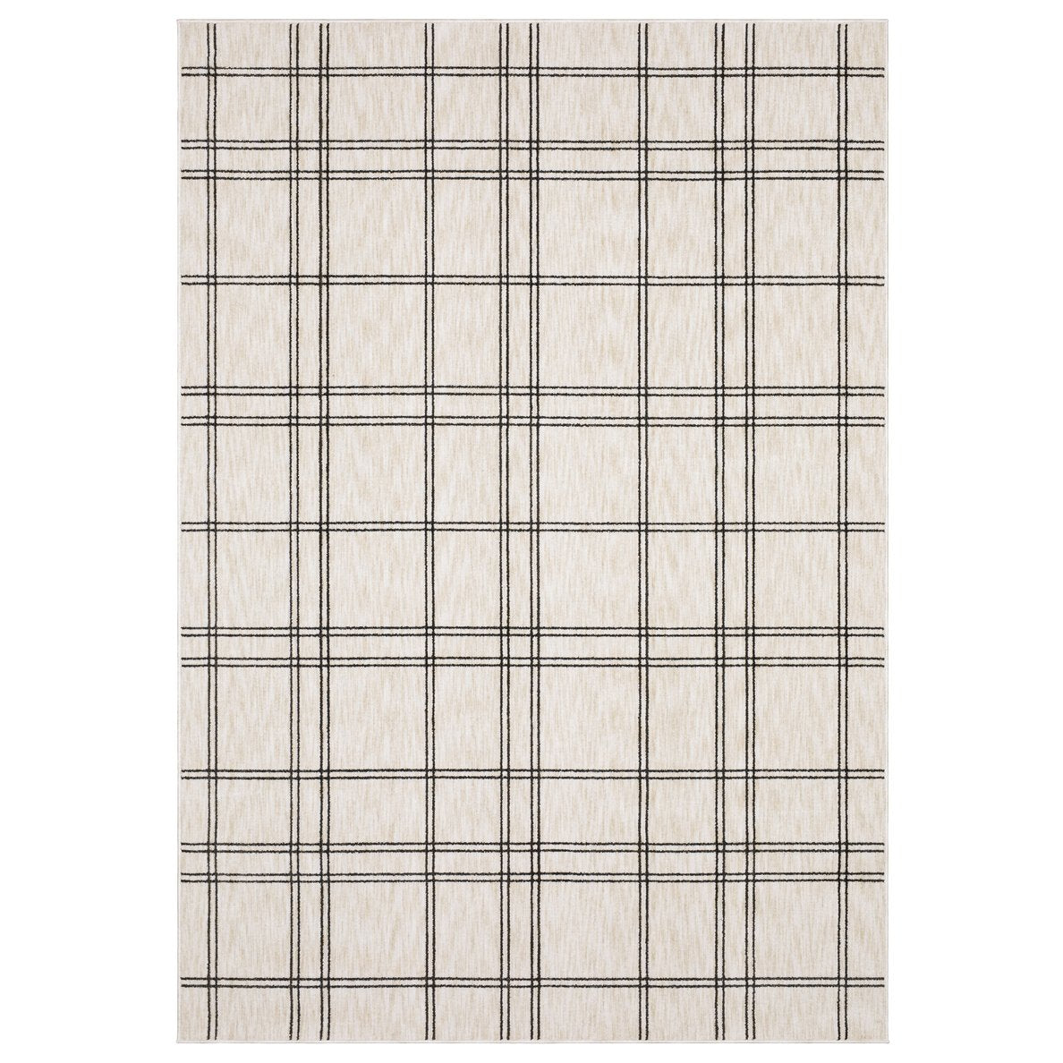 - This classic plaid area rug features a timeless grid-like pattern, with crisp black intersecting lines on a neutral cream background. The structured symmetry adds a touch of sophistication, making it perfect for modern, farmhouse, and transitional interiors. Its simple yet elegant design enhances versatility, effortlessly complementing wood, metal, and neutral-toned décor for a refined and inviting atmosphere