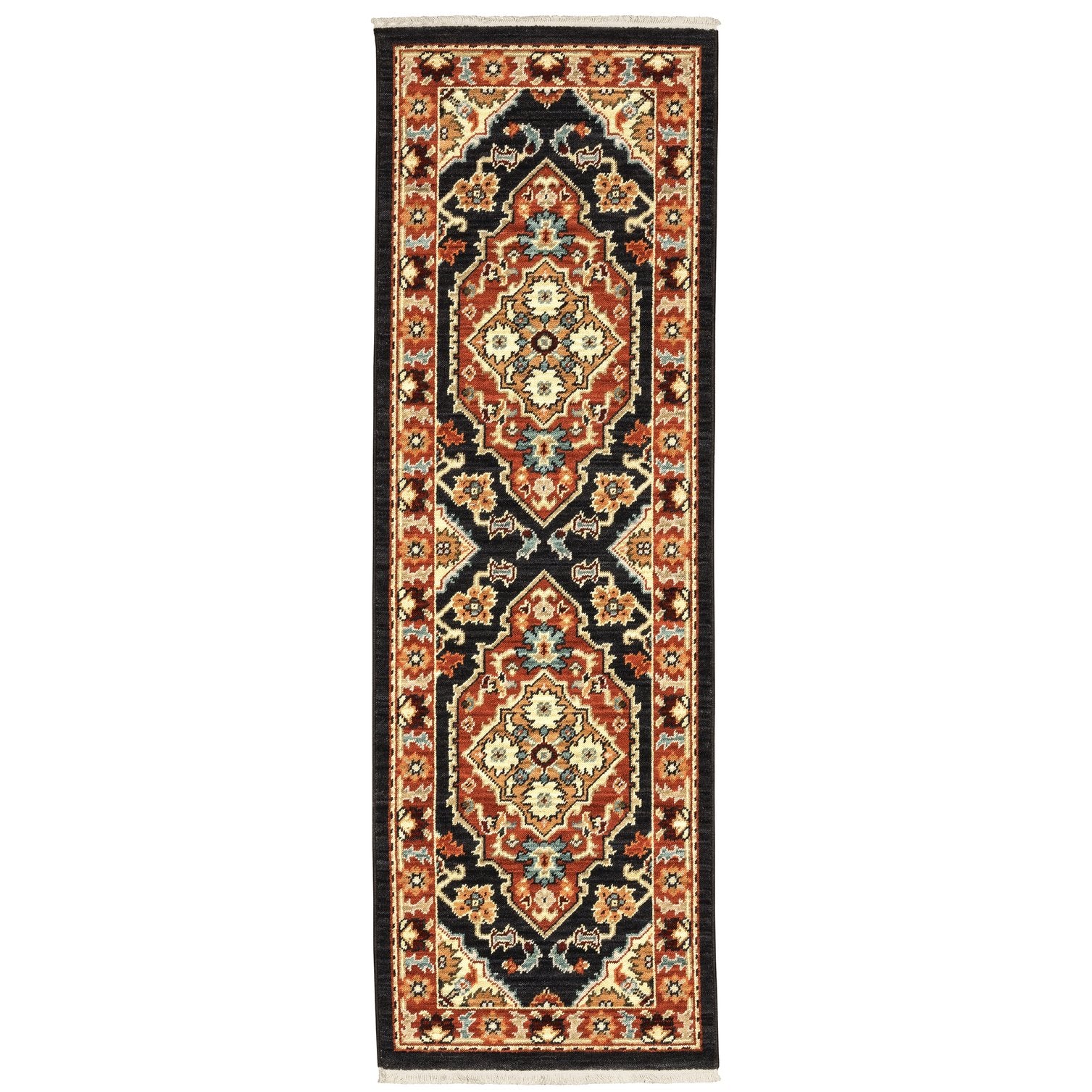- Rug features shades of black, orange, red, gold, ivory and blue