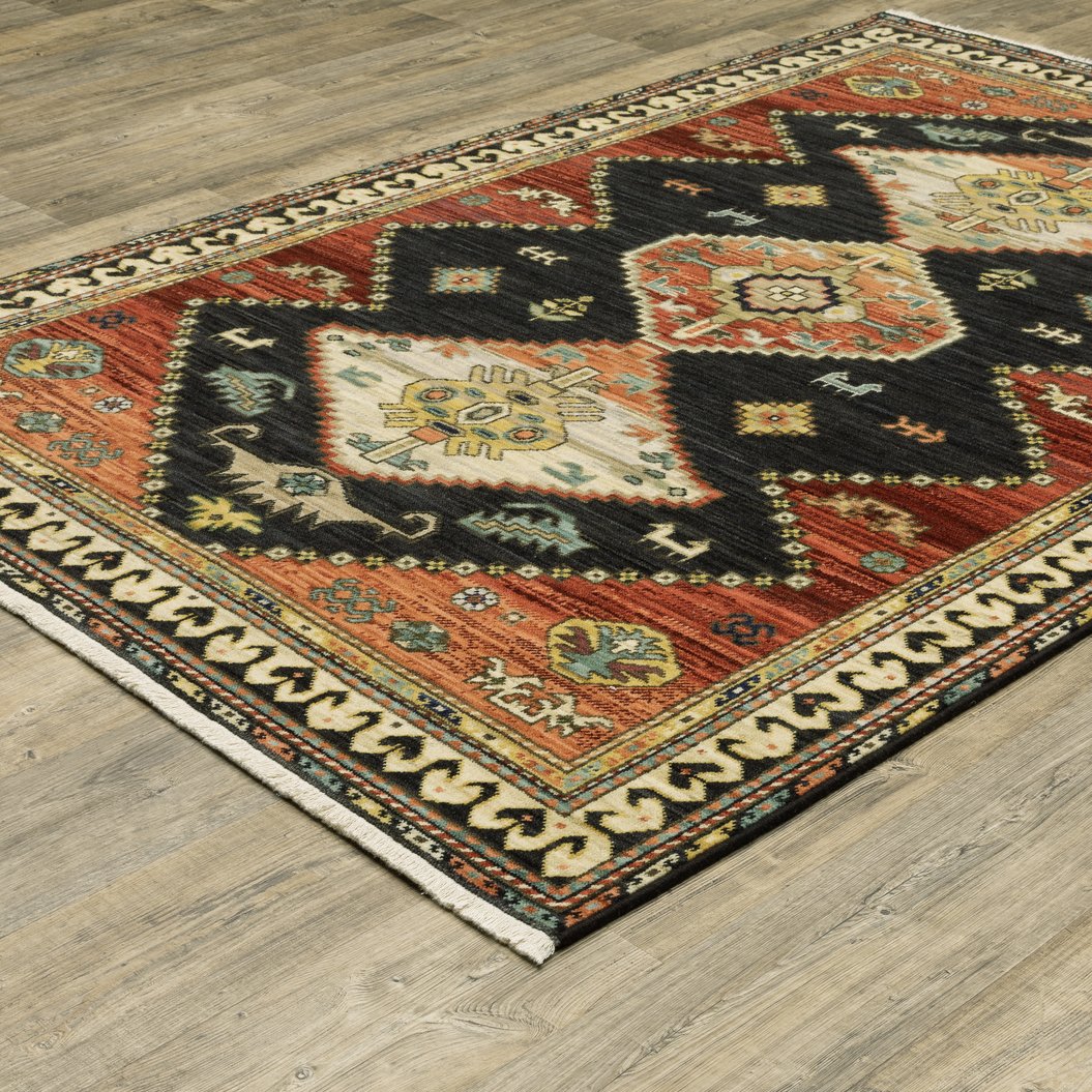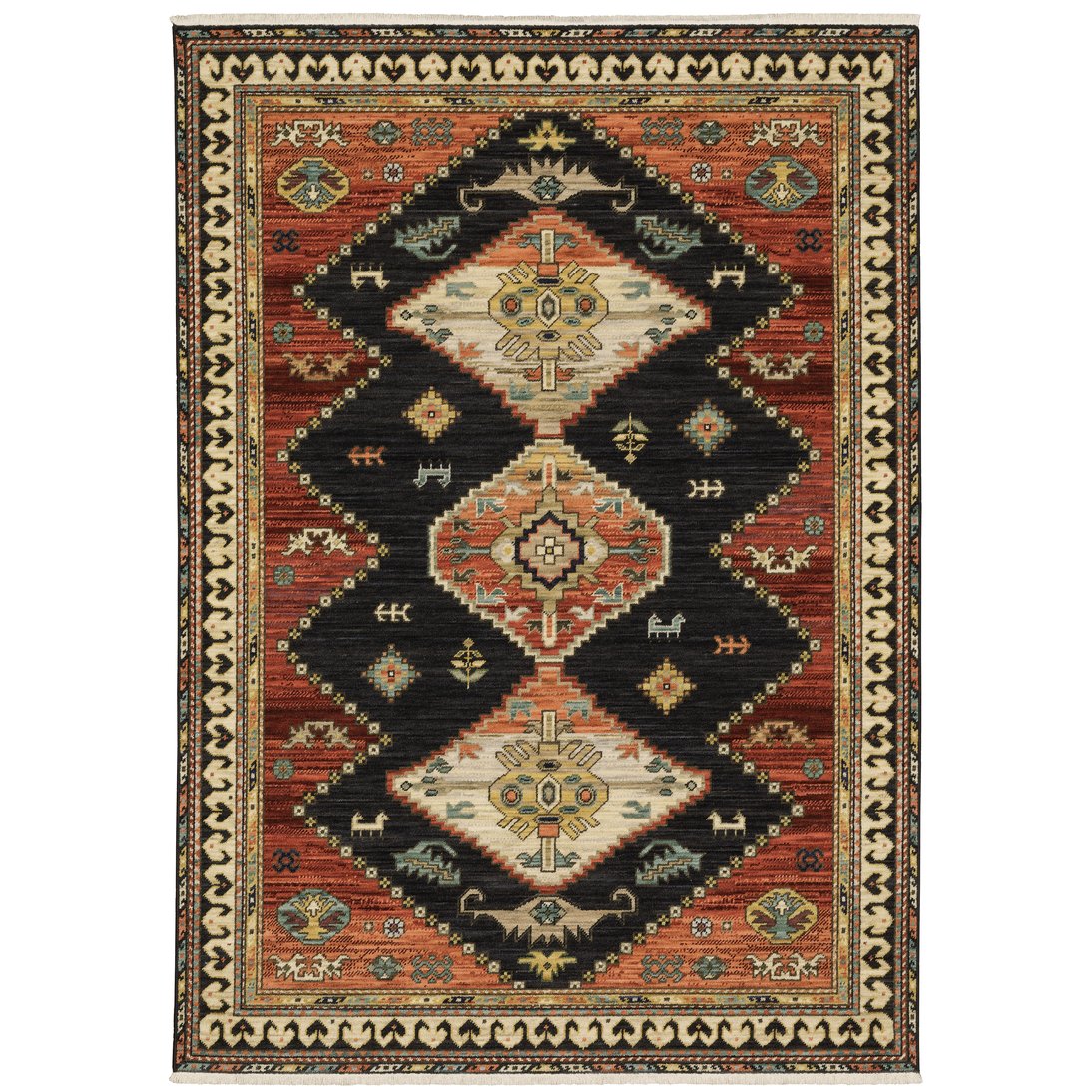 - Rug colors include shades of charcoal, brown, orange, salmon, gold, navy, pale blue, ivory