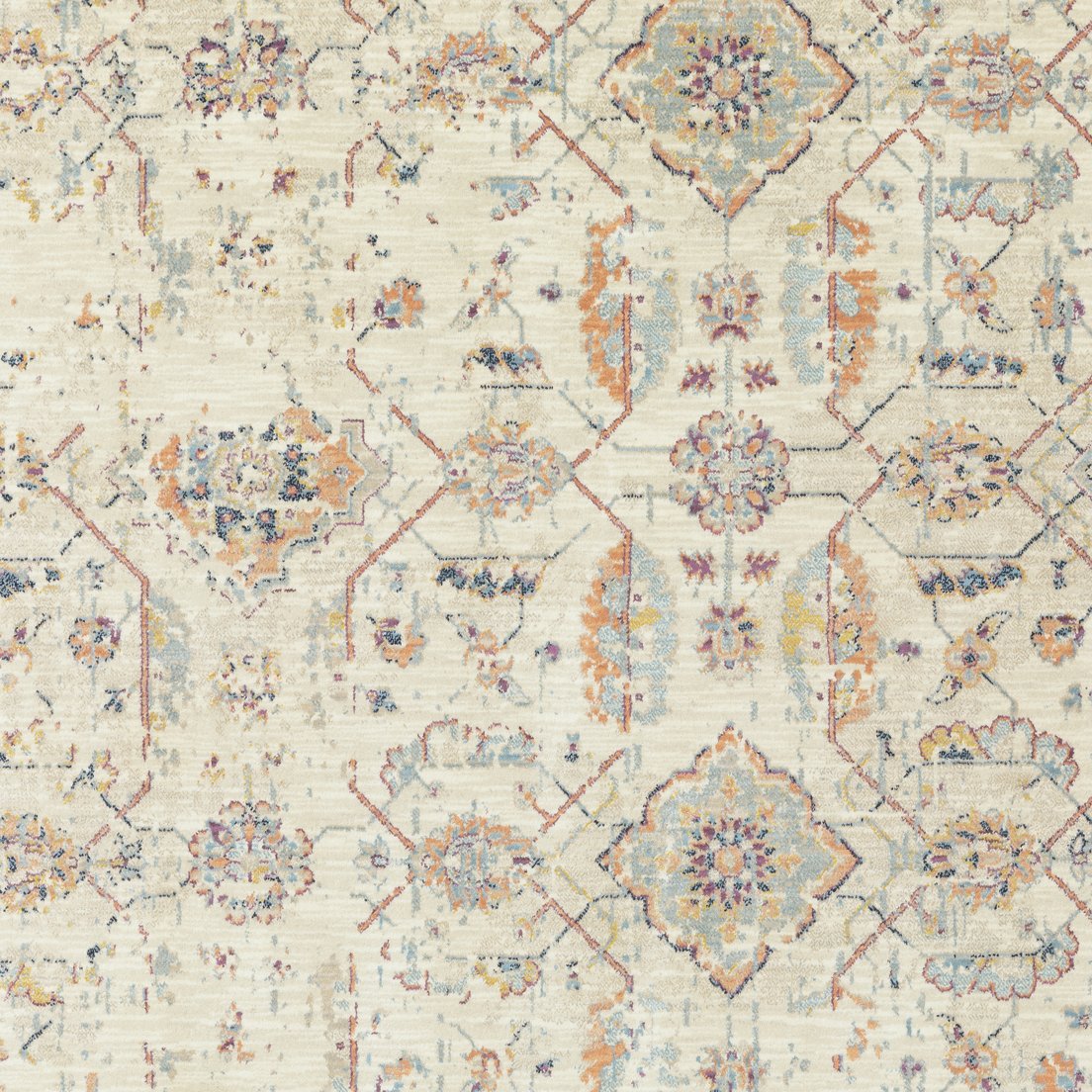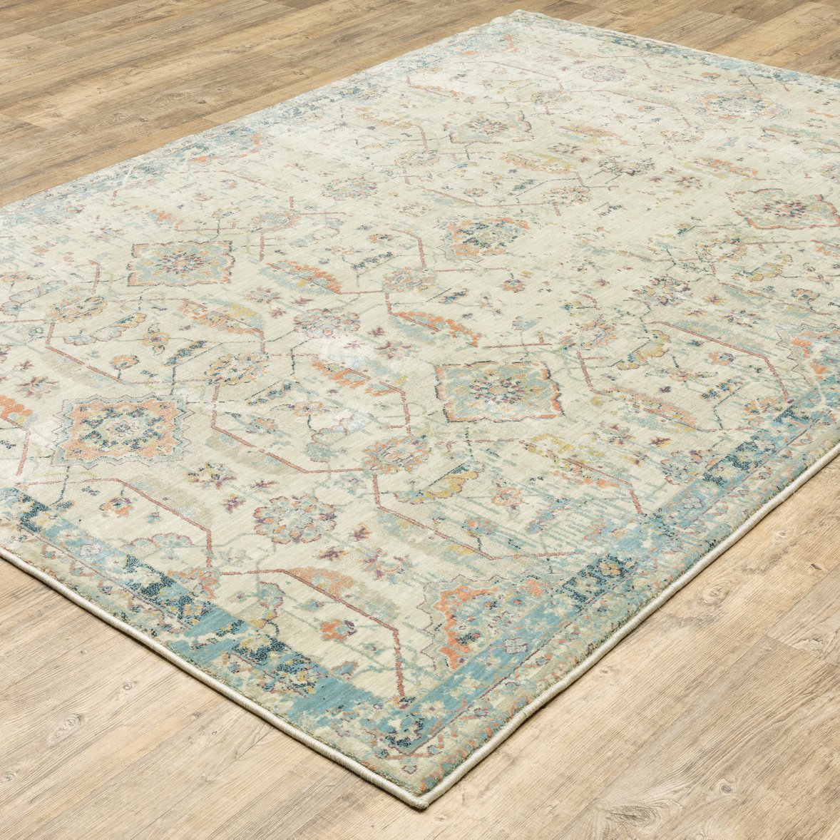 - Features a distressed oriental-tribal pattern