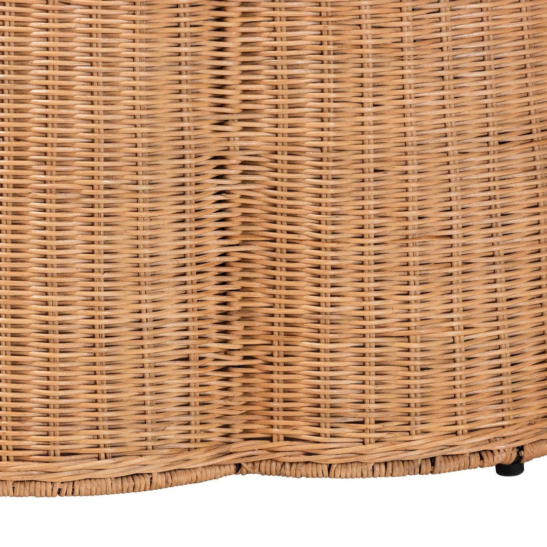 Add a relaxed, coastal-boho accent to your living room, bedroom, or sunroom with this handwoven rattan ottoman. Its scalloped, round silhouette and minimalist metal frame showcase artisanal Indonesian craftsmanship while the plush, removable cushion provides comfortable seating or a cozy footrest. Lightweight yet sturdy, this ottoman brings natural texture and laid-back elegance to modern and eclectic interiors.